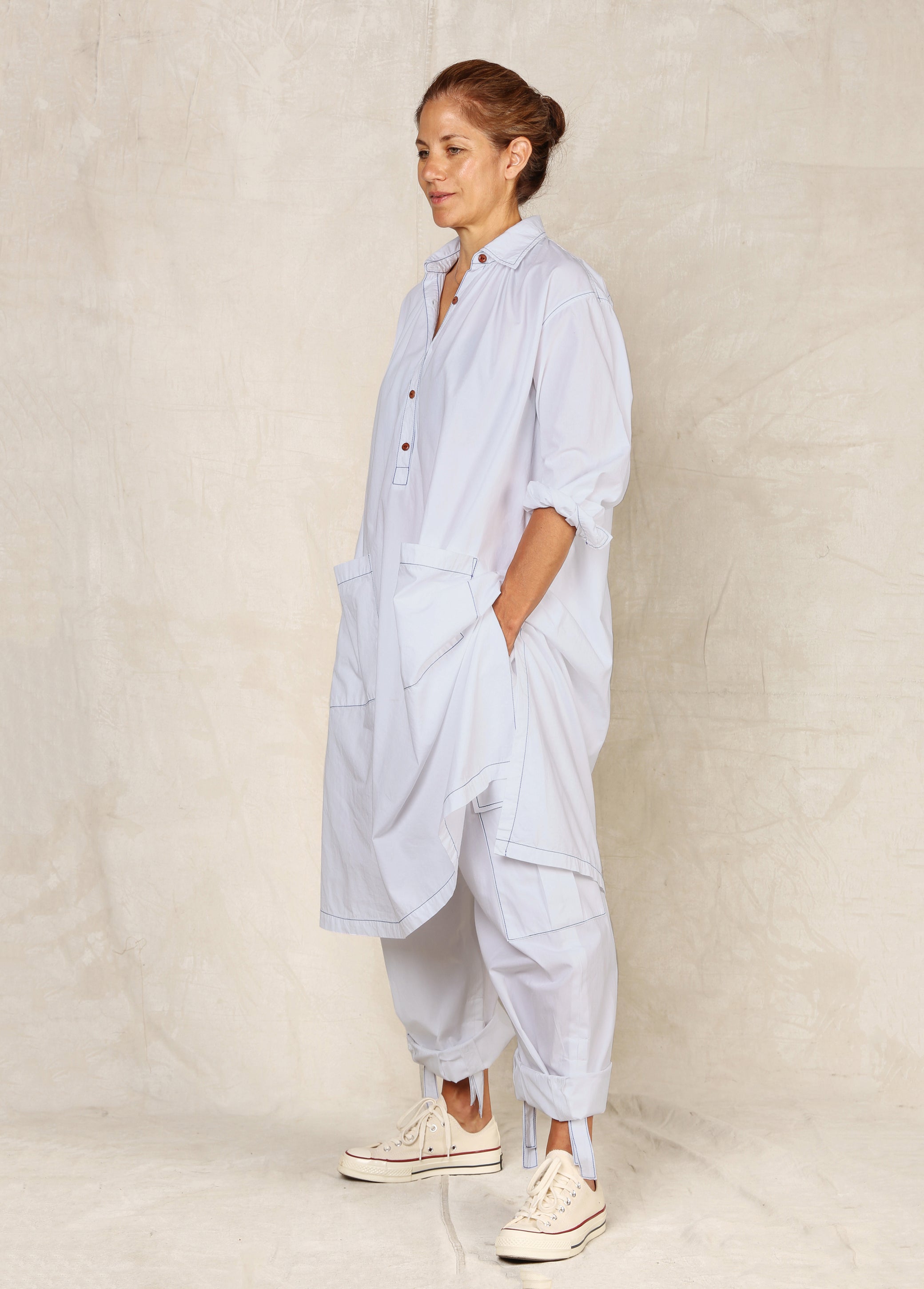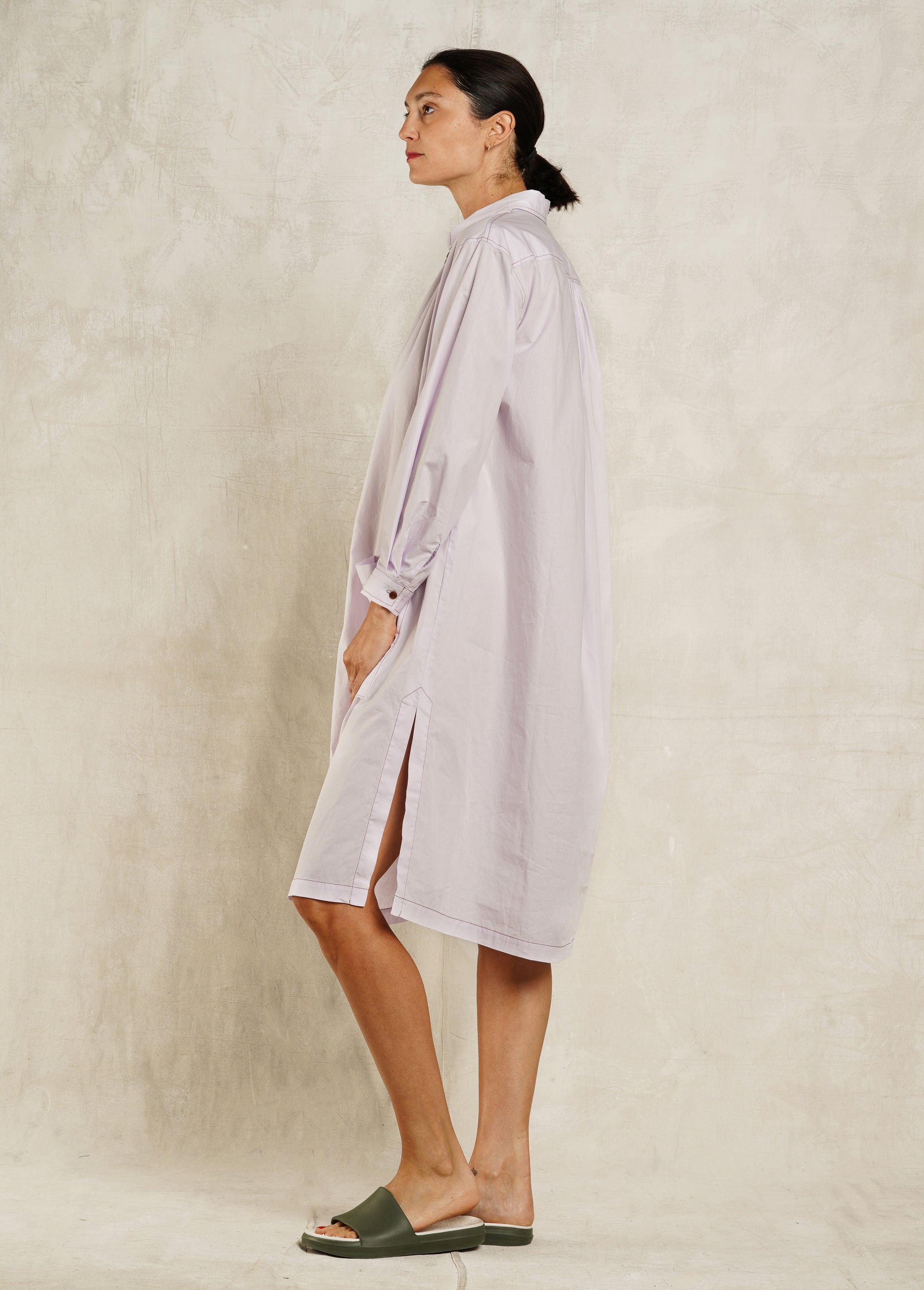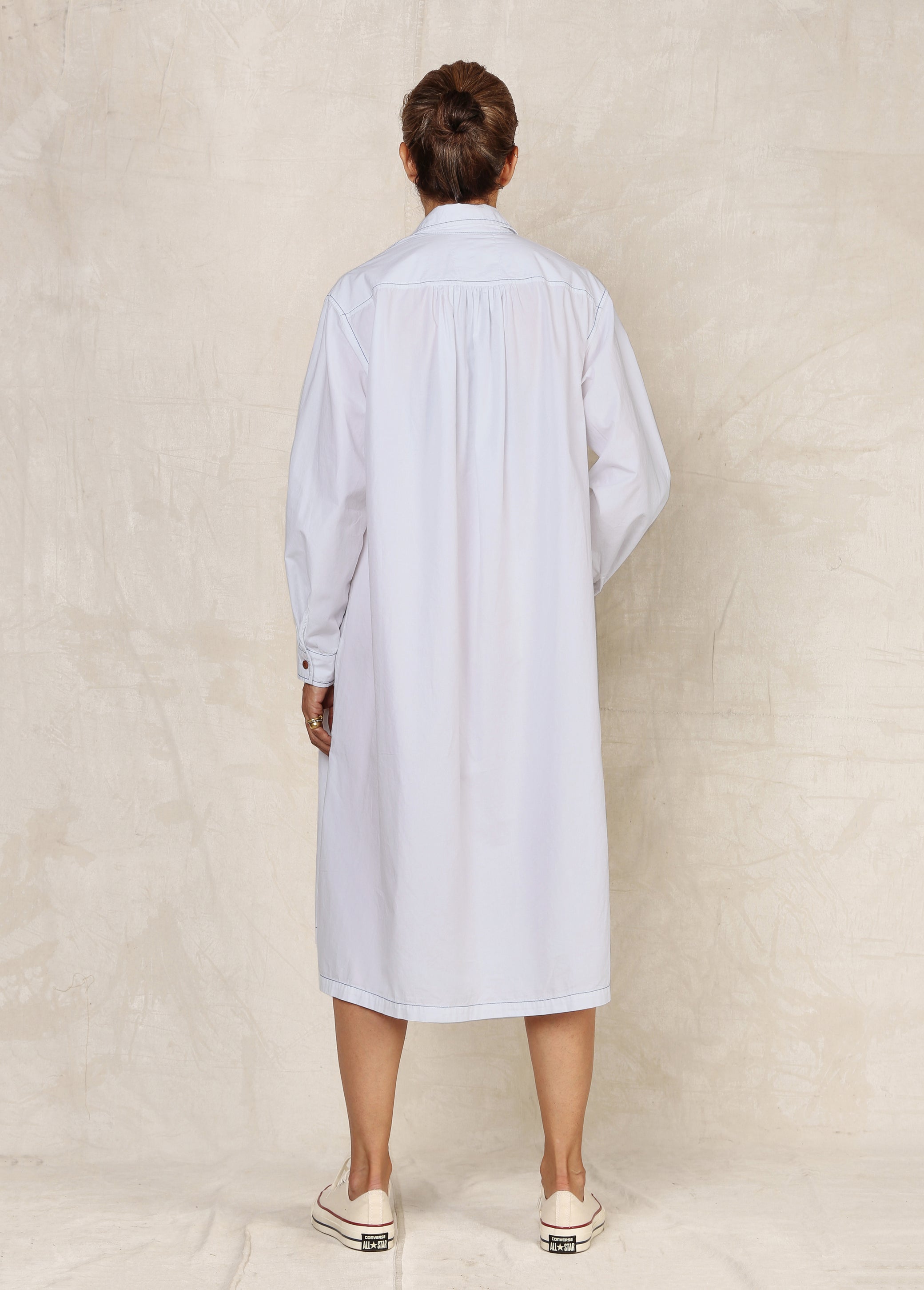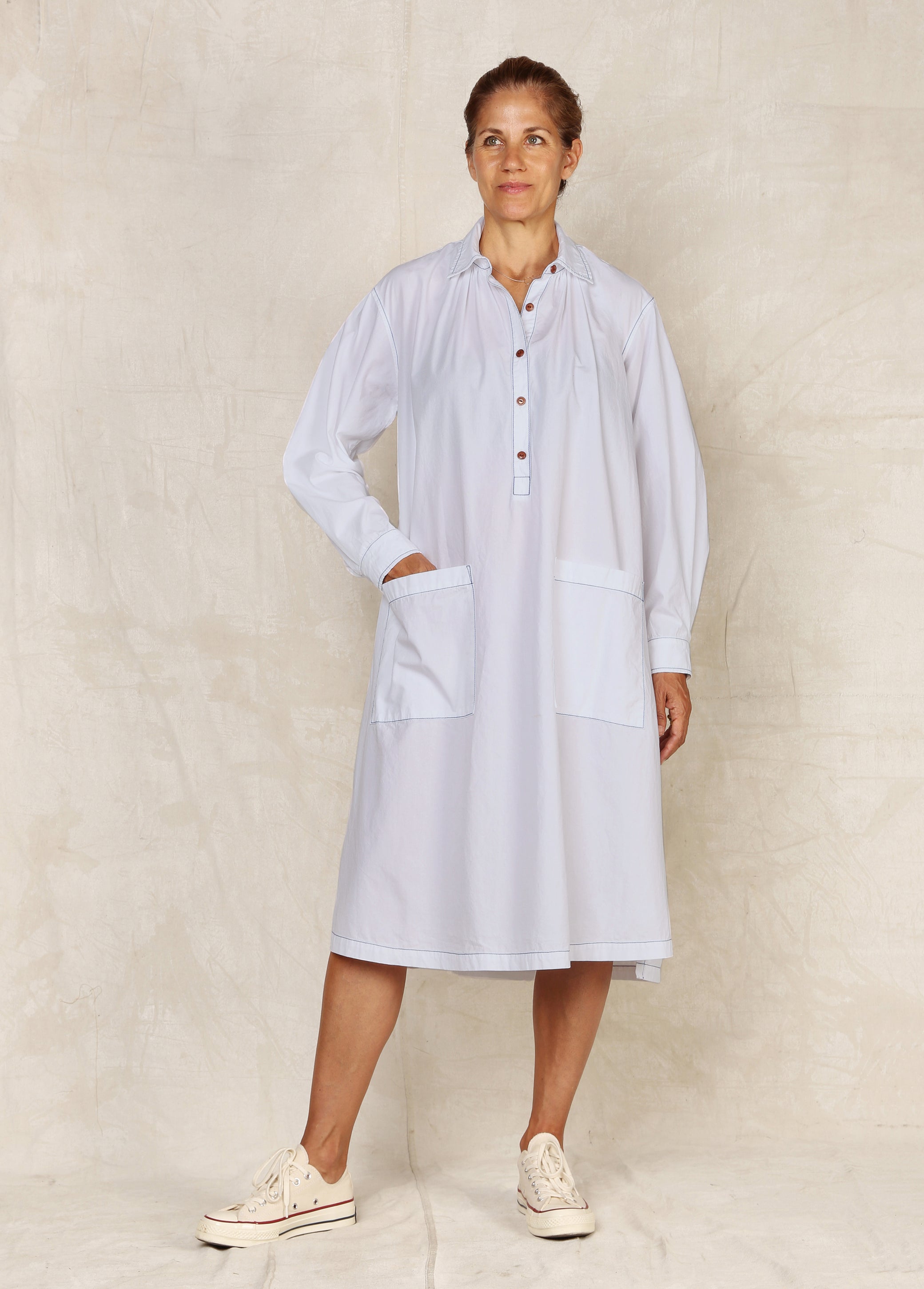 Inspired by minimalist artist Agnes Martin, this dress is made from a lightweight crisp, Japanese cotton poplin. A classic shape with modern details. It has a classic shirt collar and two front pockets. Drop shoulder, generous cut & relaxed fit that allows for easy movement. Pull over with 5 buttons on front placket. Subtle gathers at front collar, back yolk, & sleeve cuffs. A line cut and side slits with a graduated hem.