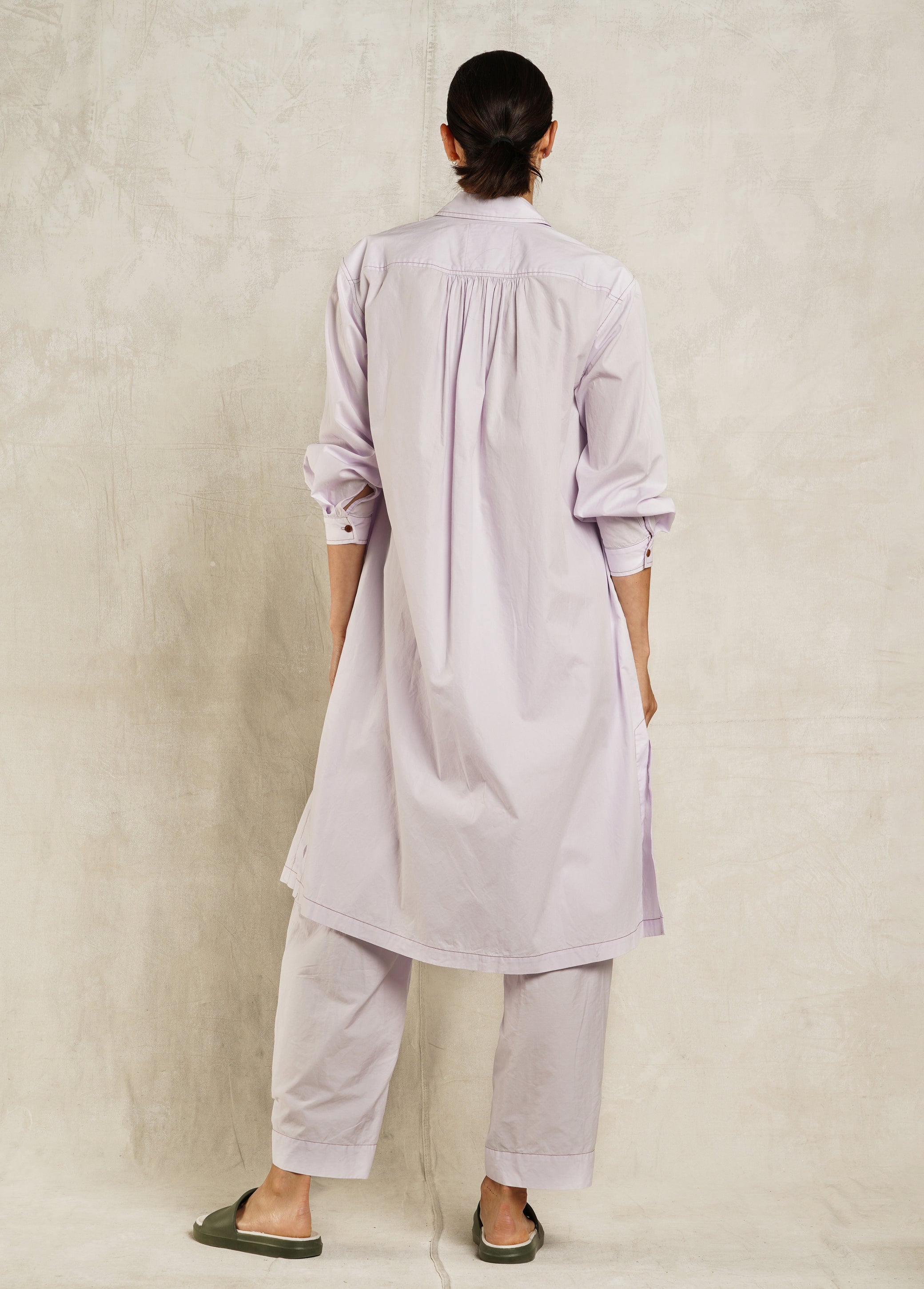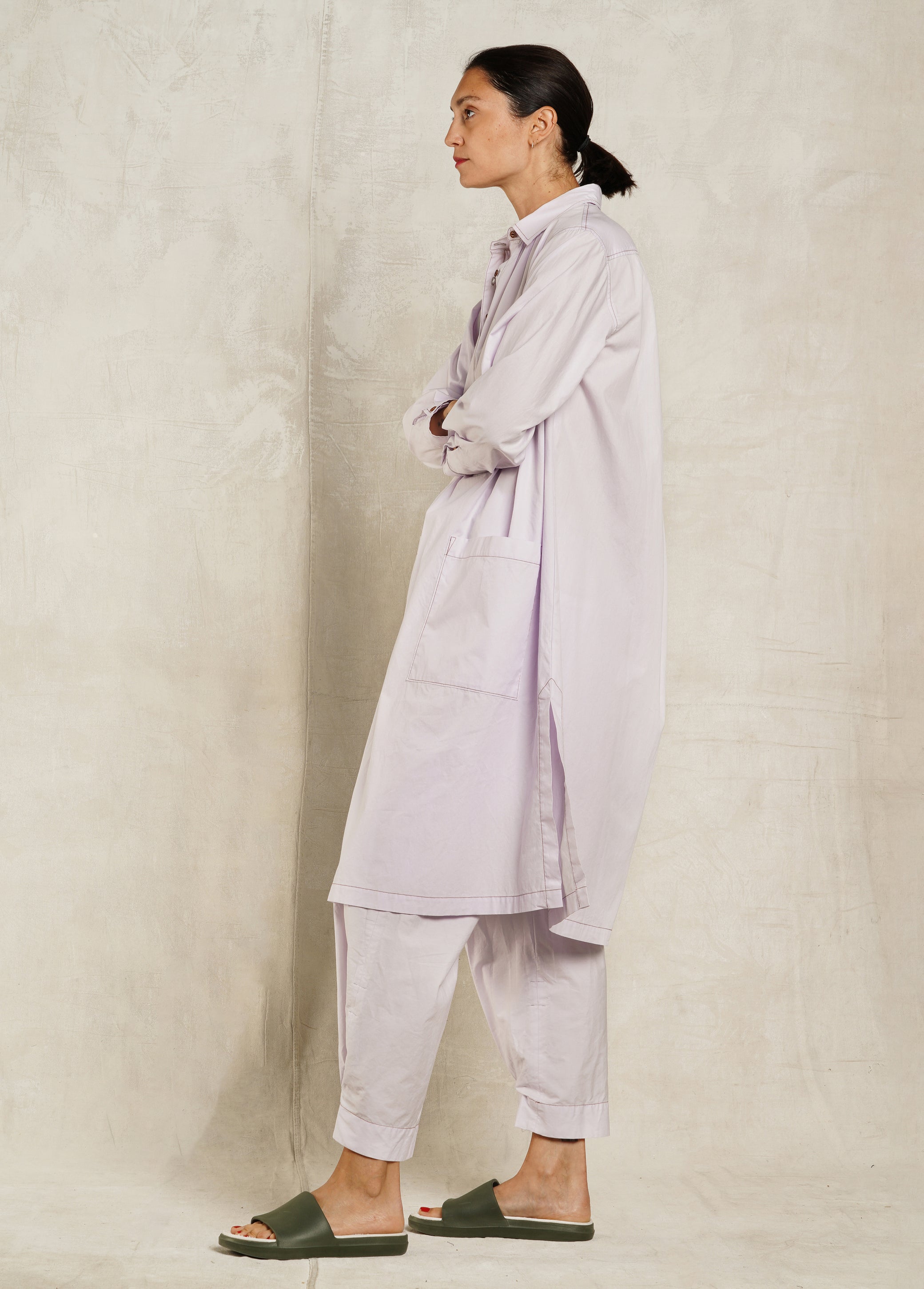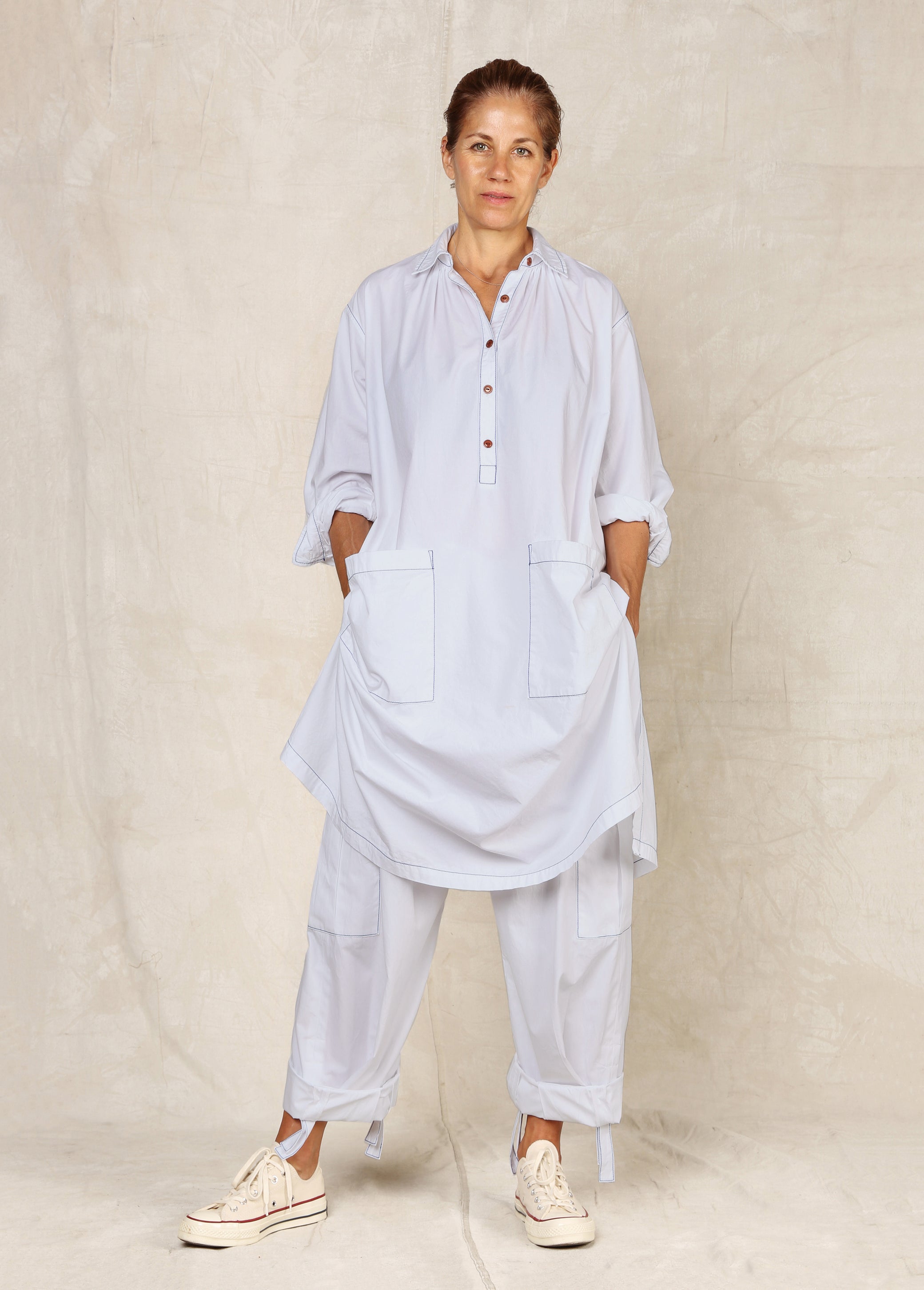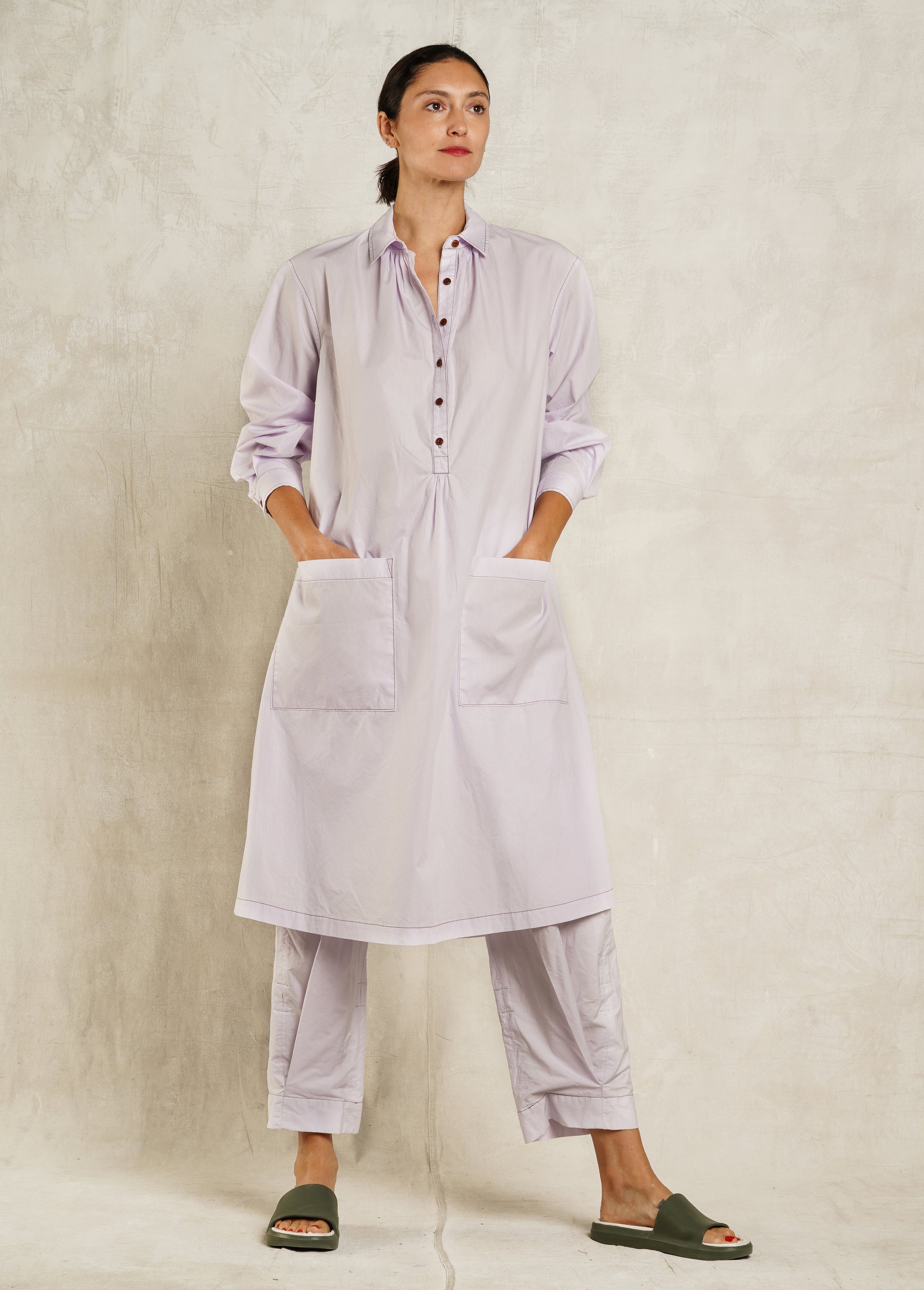 Inspired by minimalist artist Agnes Martin, this dress is made from a lightweight crisp, Japanese cotton poplin. A classic shape with modern details. It has a classic shirt collar and two front pockets. Drop shoulder, generous cut & relaxed fit that allows for easy movement. Pull over with 5 buttons on front placket. Subtle gathers at front collar, back yolk, & sleeve cuffs. A line cut and side slits with a graduated hem.