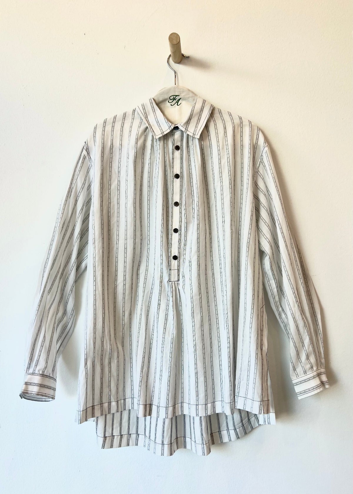 Our artist smocks, inspired by the quiet elegance of Agnes Martin, are cut from organic lightweight yarn-dye cotton from Japan and blends a classic silhouette with modern details. It features a shirt collar, a high-low hem with deep side slits, and drop shoulders for an easy, relaxed fit. Subtle gathers accent the front collar, back yoke, and sleeve cuffs, while a button front placket completes the look.