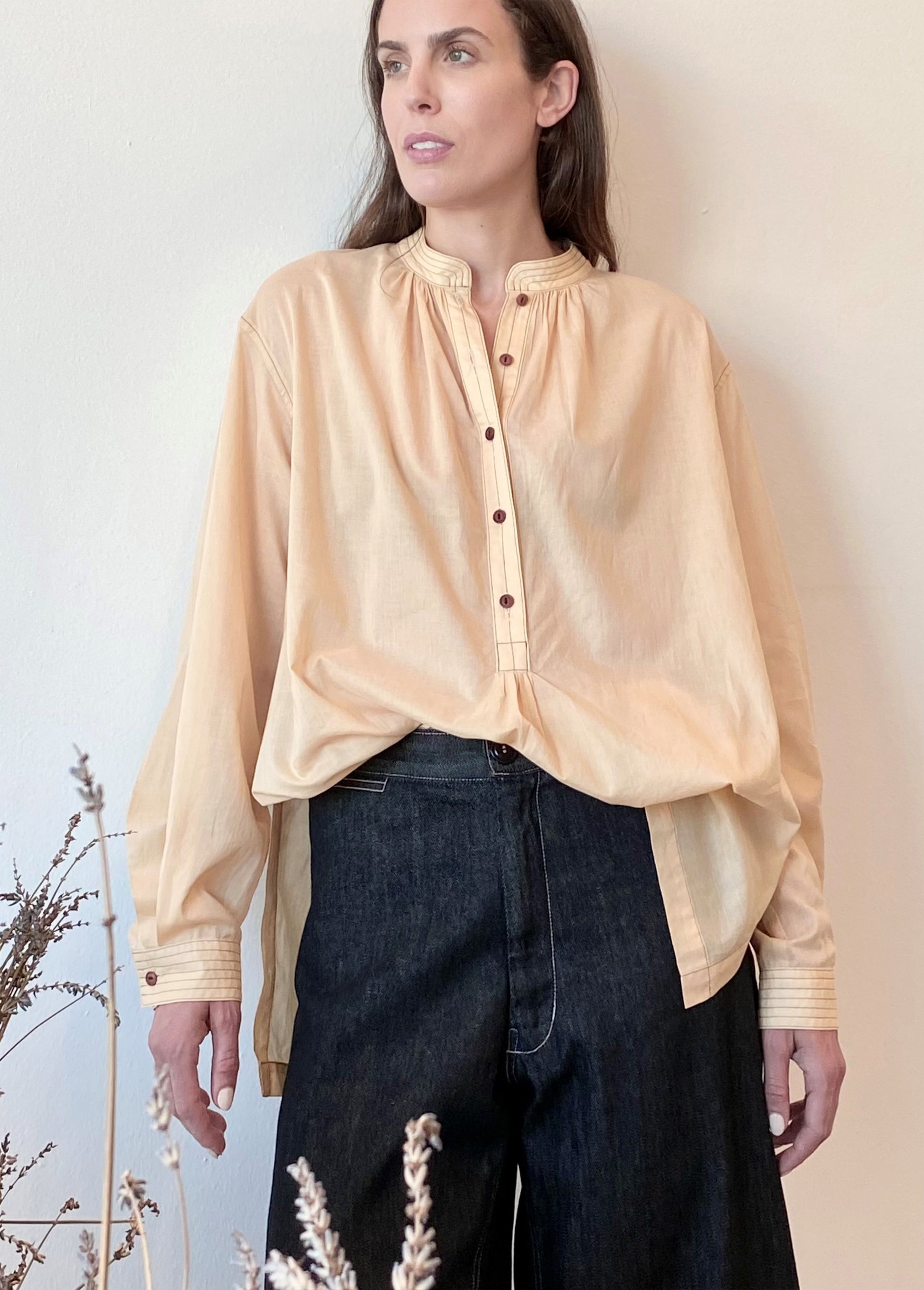 Our new, updated artist smock inspired by artist, Agnes Martin in a range of summer colors. Made from a cotton voile. It has a classic & traditional shape with modern details. Features are a banded shirt collar, high low hem, with high side slits. Drop shoulder with generous A line cut & relaxed fit that allows for easy movement. Button front with 5 buttons on front placket. Subtle gathers at front collar, back yolk, & sleeve cuffs.
