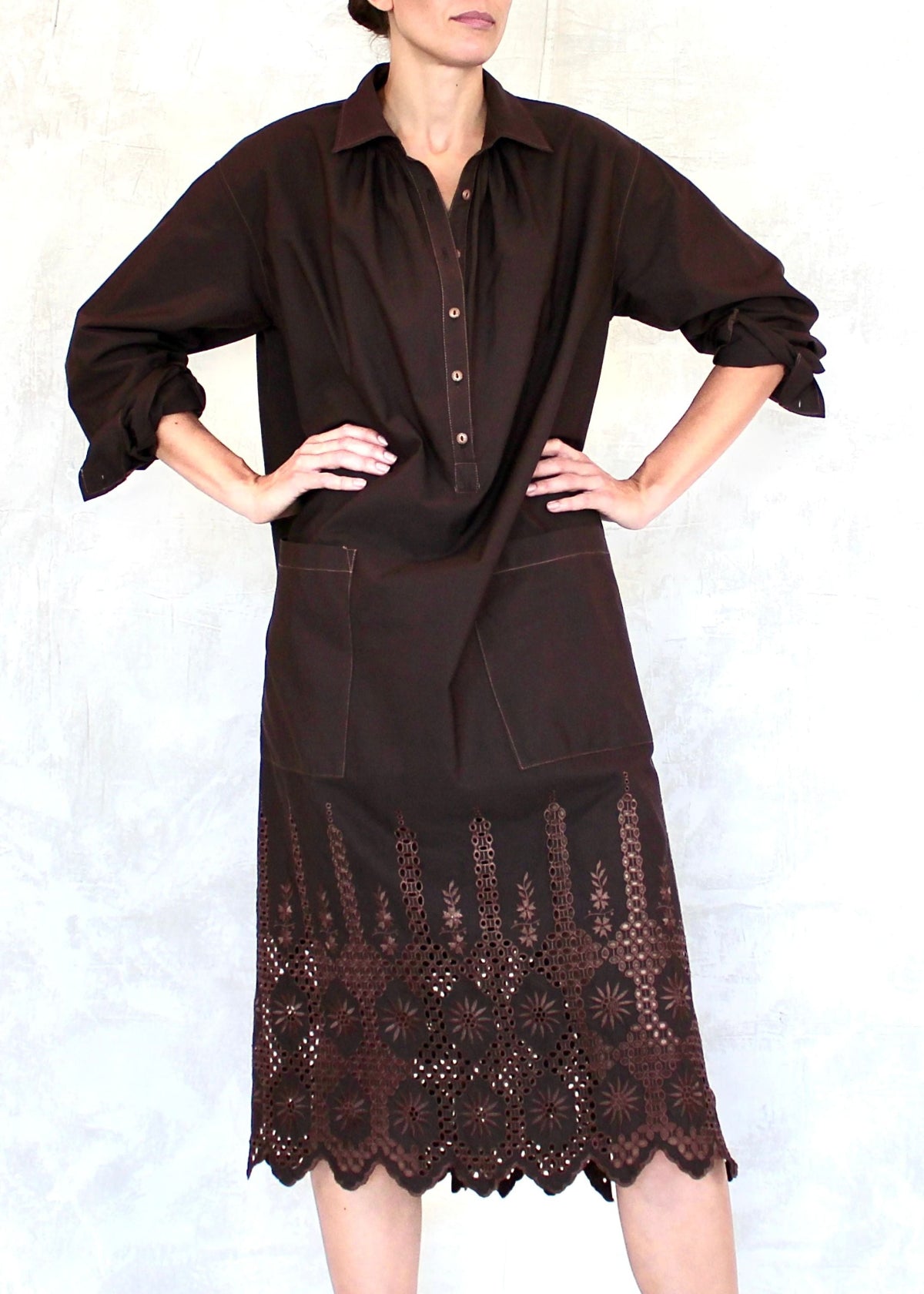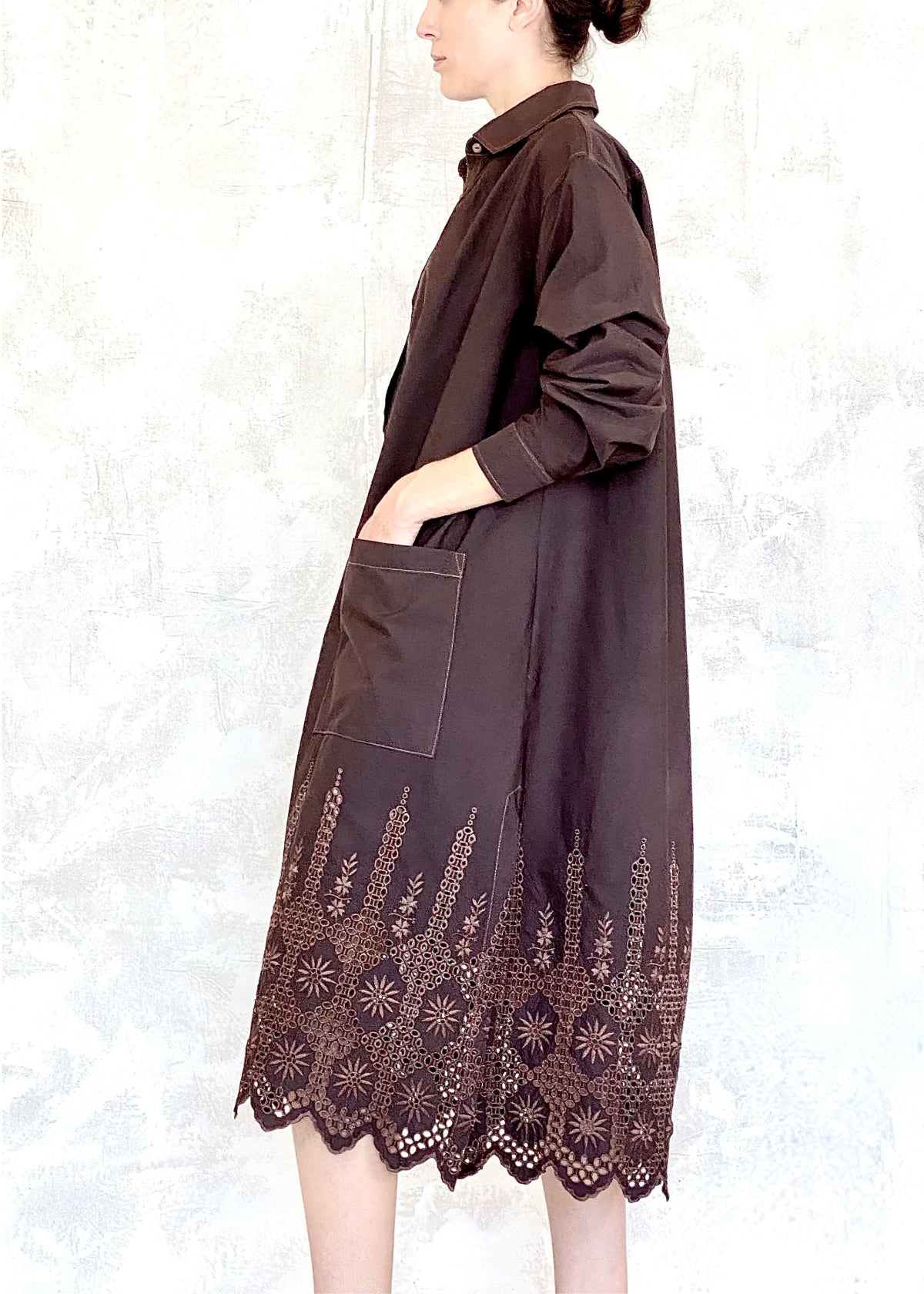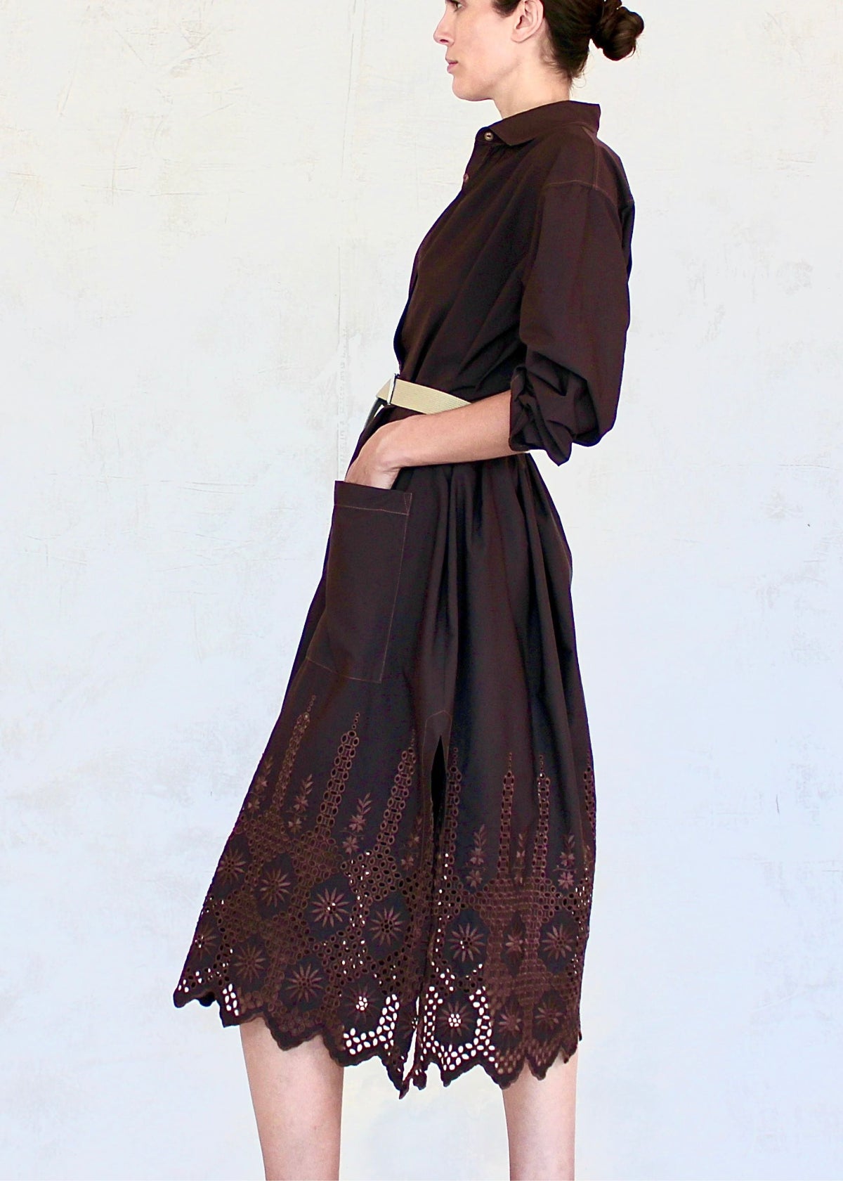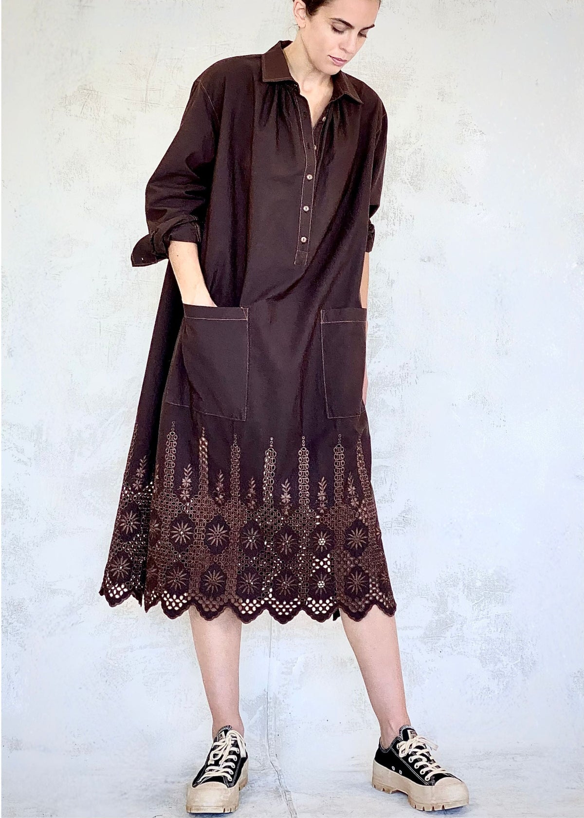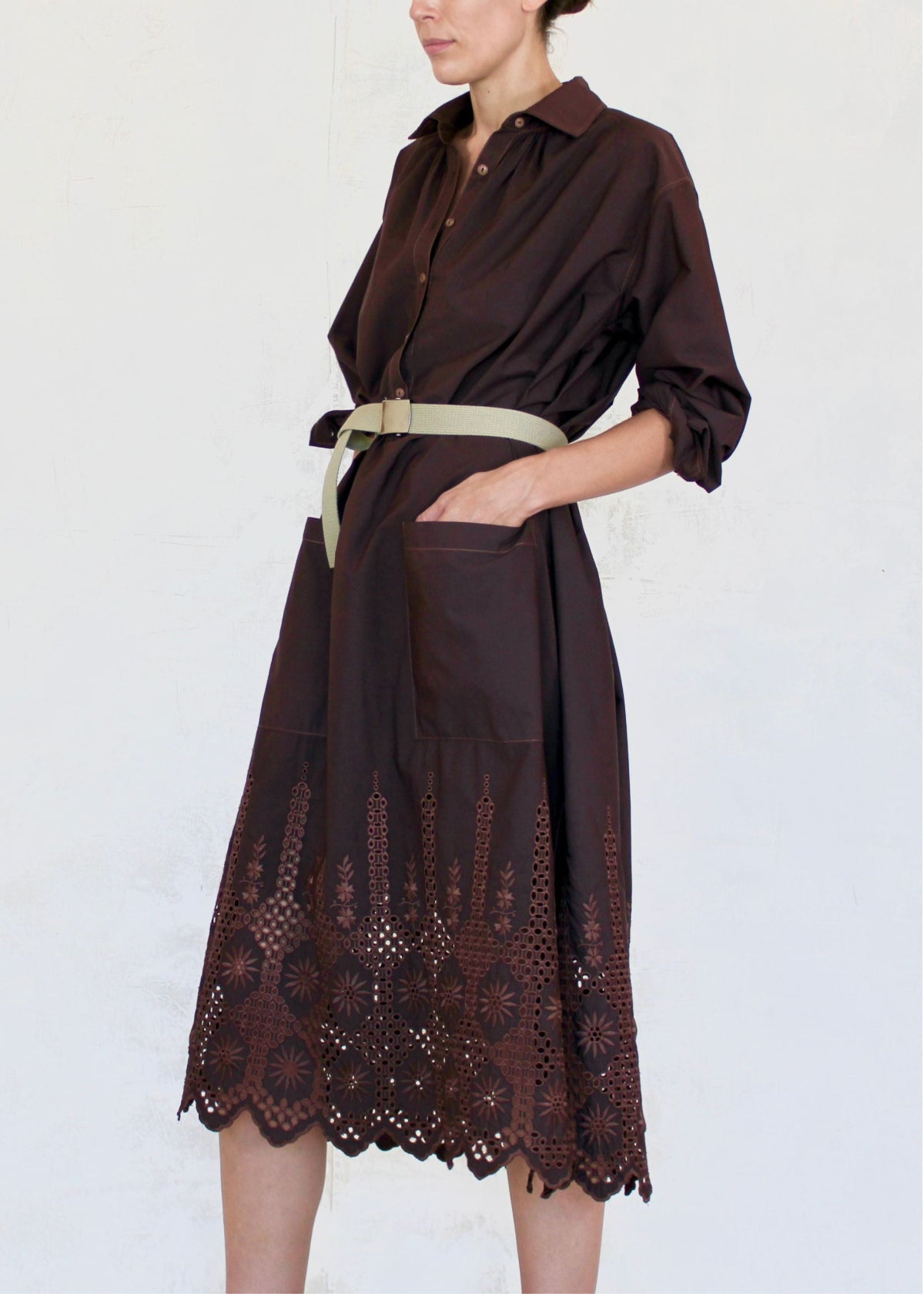 Inspired by minimalist artist Agnes Martin, this dress is made from an over dyed lightweight crisp, eyelet cotton poplin. A classic shape with modern details. It has a classic shirt collar and two front pockets. Drop shoulder, generous cut & relaxed fit that allows for easy movement. Pull over with 5 buttons on front placket. Subtle gathers at front collar, back yolk, & sleeve cuffs. A line cut and side slits with a graduated hem. Wear belted for a more tailored look or enjoy the simplicity and ease of our classic silhouette.