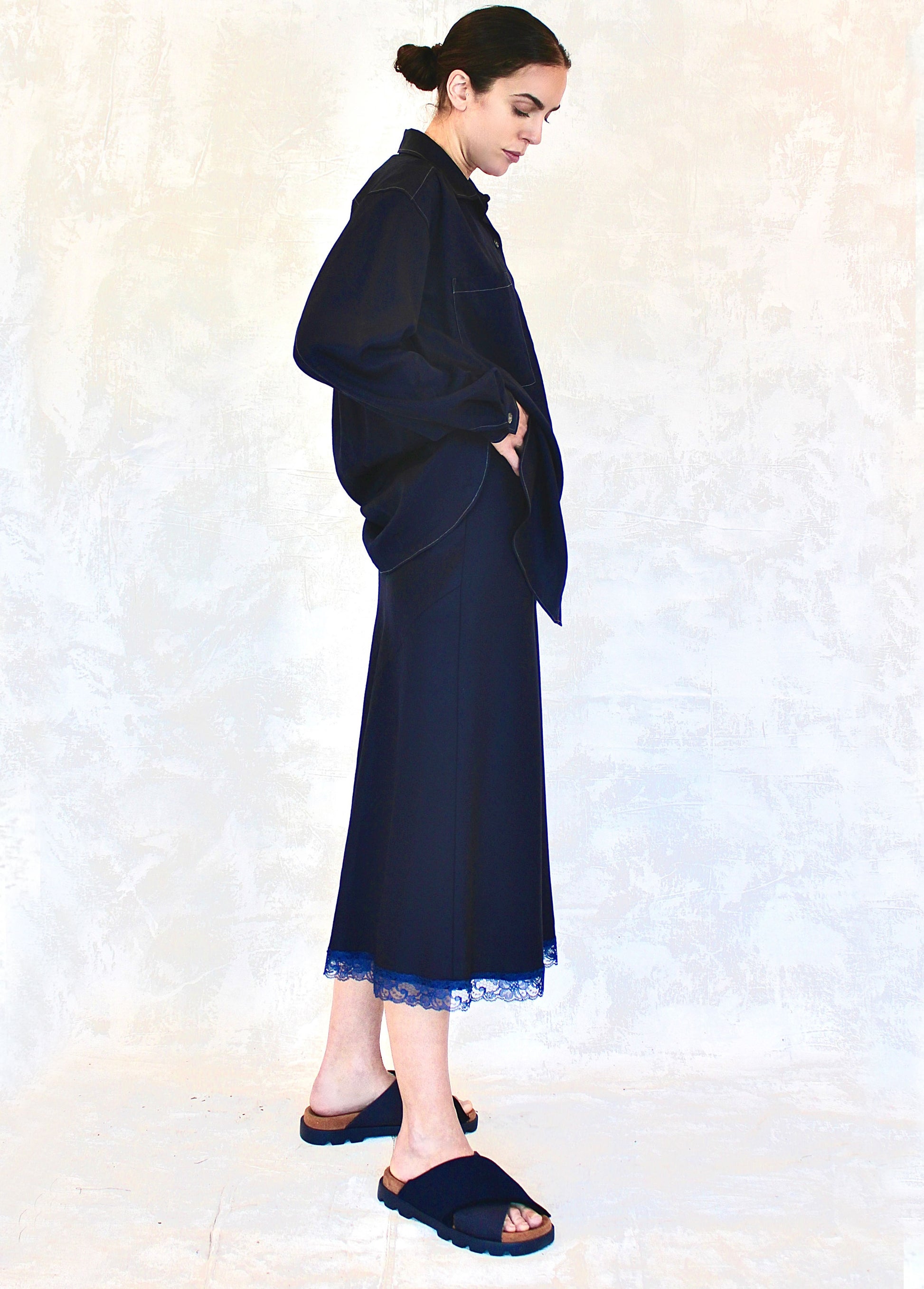 This bias skirt is made in an eco friendly tencel blend, has a relaxed fit and refined details. It has Chantilly lace trim at the hem and an exposed black elastic waist. Wear it with our tencel Field Shirt. Tencel is a biodegradable fiber made using wood pulp or regenerated cellulosic fibers.