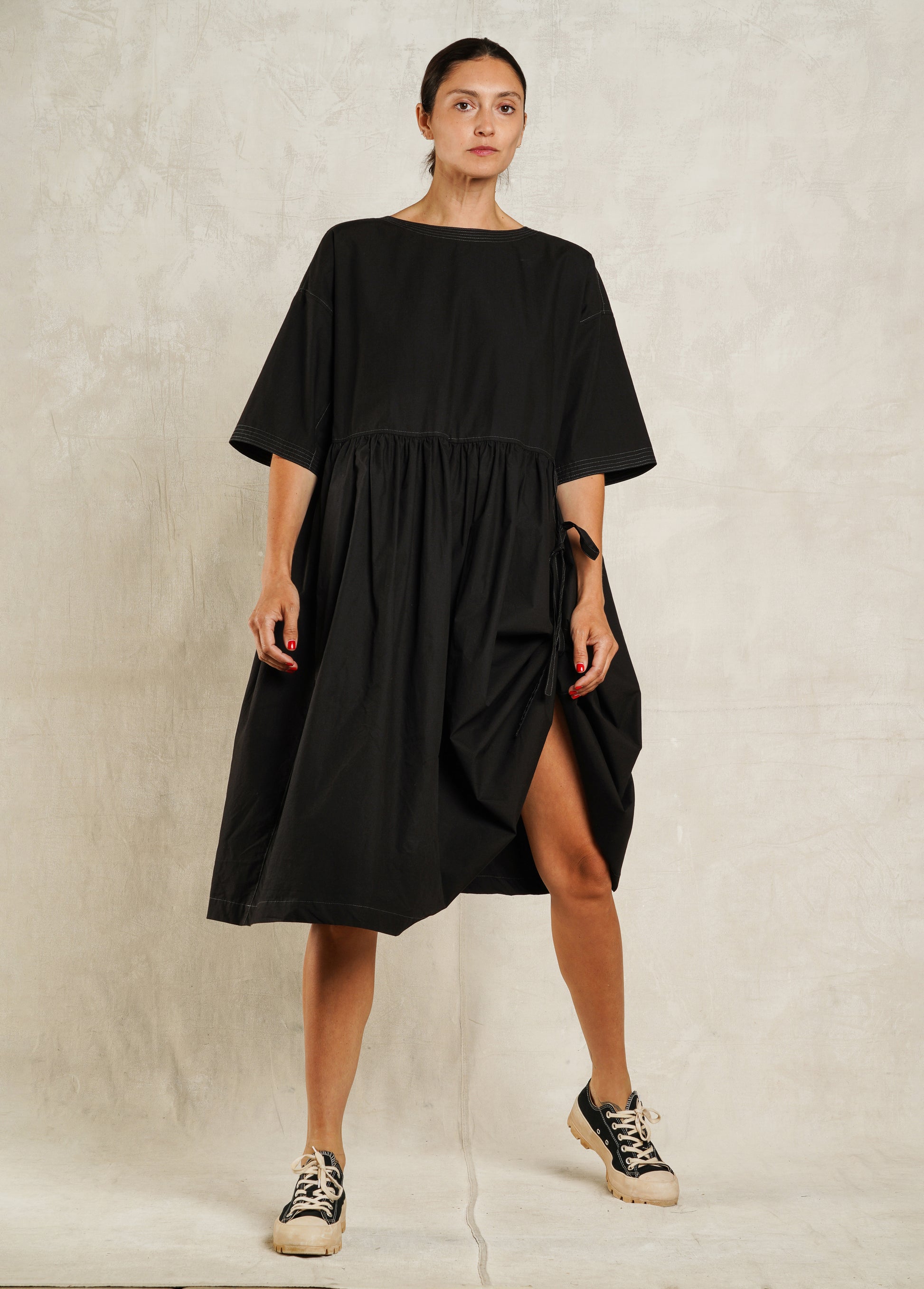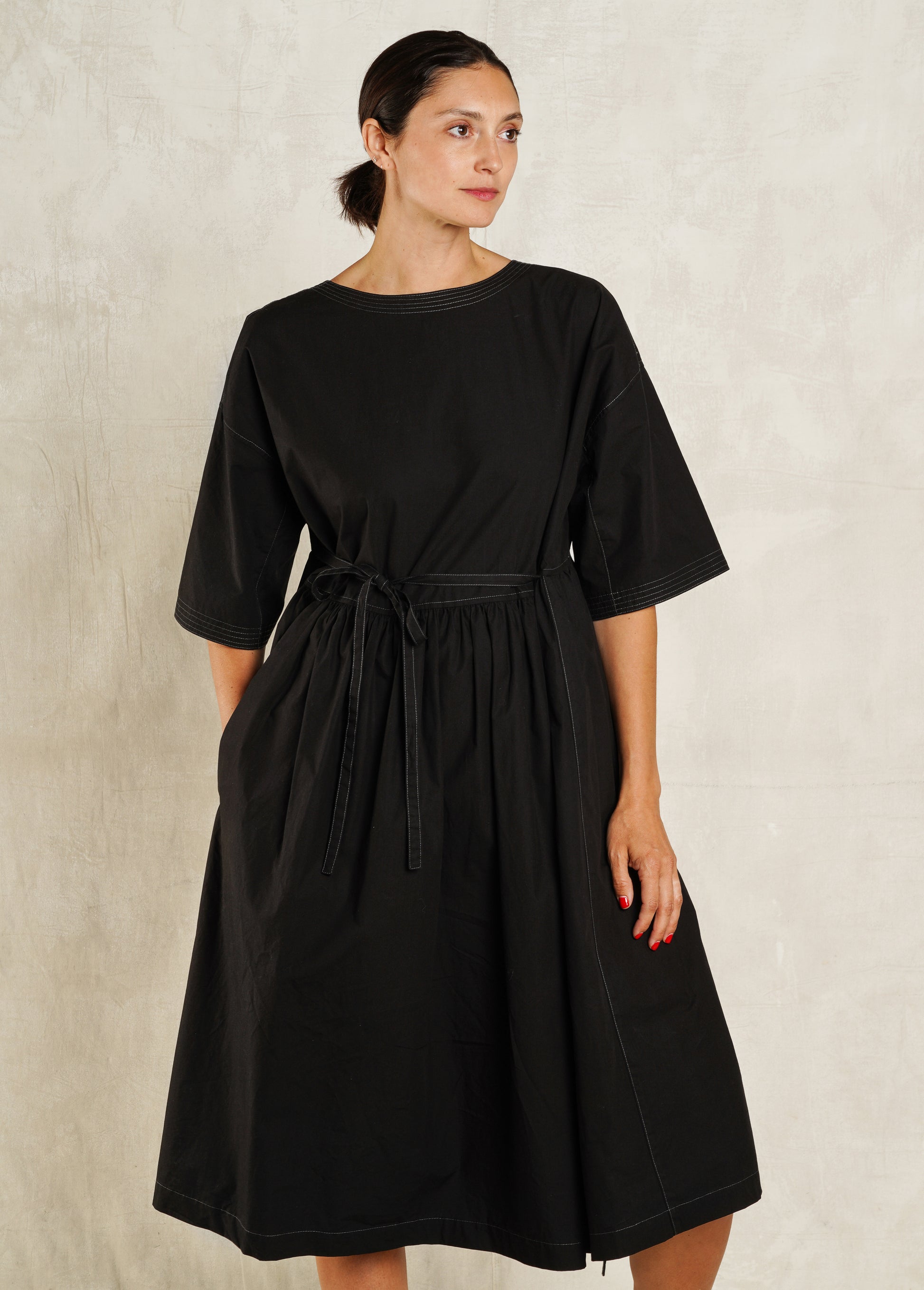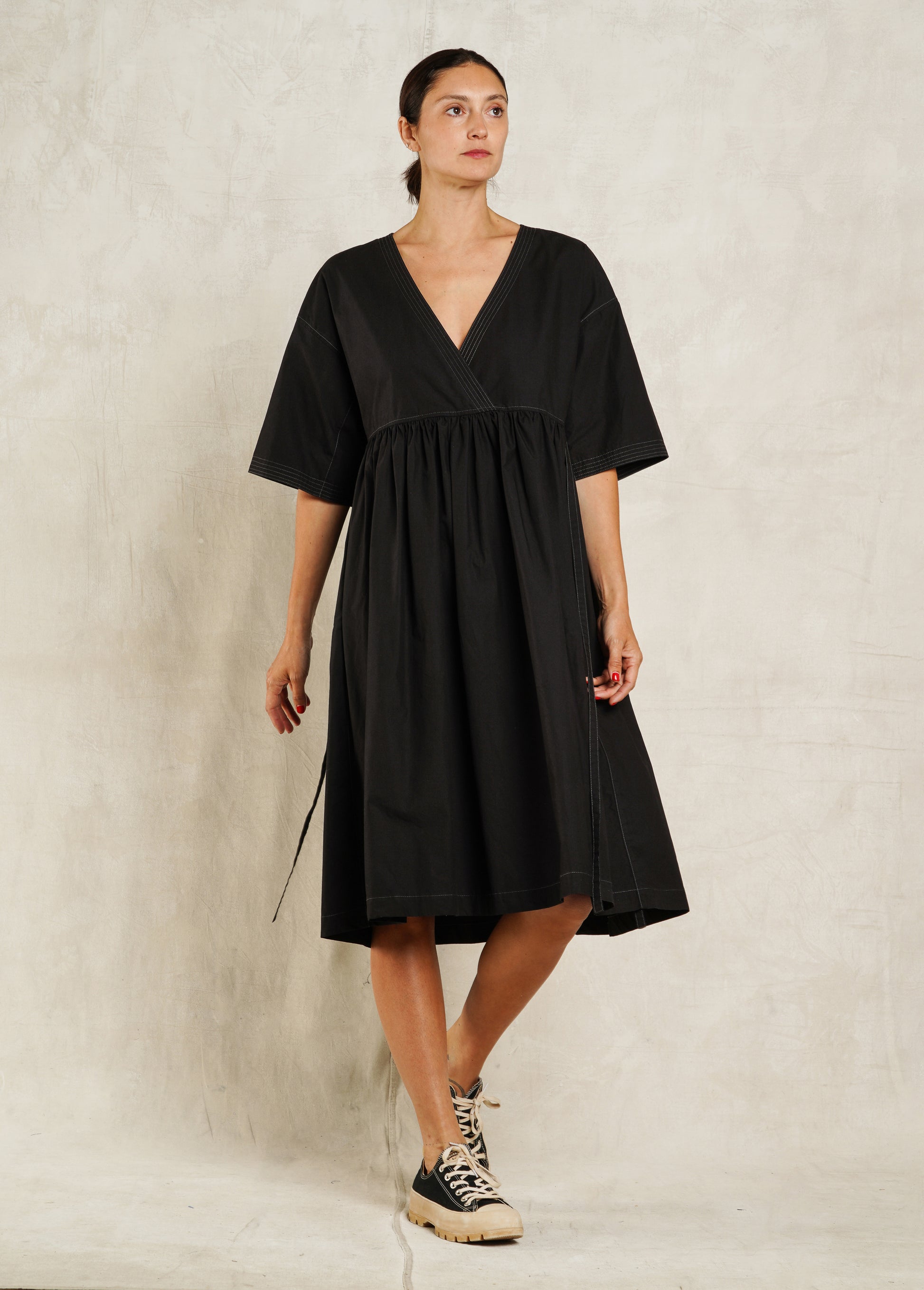 With its relaxed drape, this crisp, Japanese organic cotton poplin dress is the most versatile dress for the season, ideal for summers in the garden or an evening outing. Wear it "back to front or front to back". Details include 2 ties (one in front and one in back) that allow the dress to be cinched up or worn down, a cross over "V" neckline, and a right side pocket in both back and front. Signature stitching on sleeves and around the neck. Also available in an organic hemp/cotton denim.