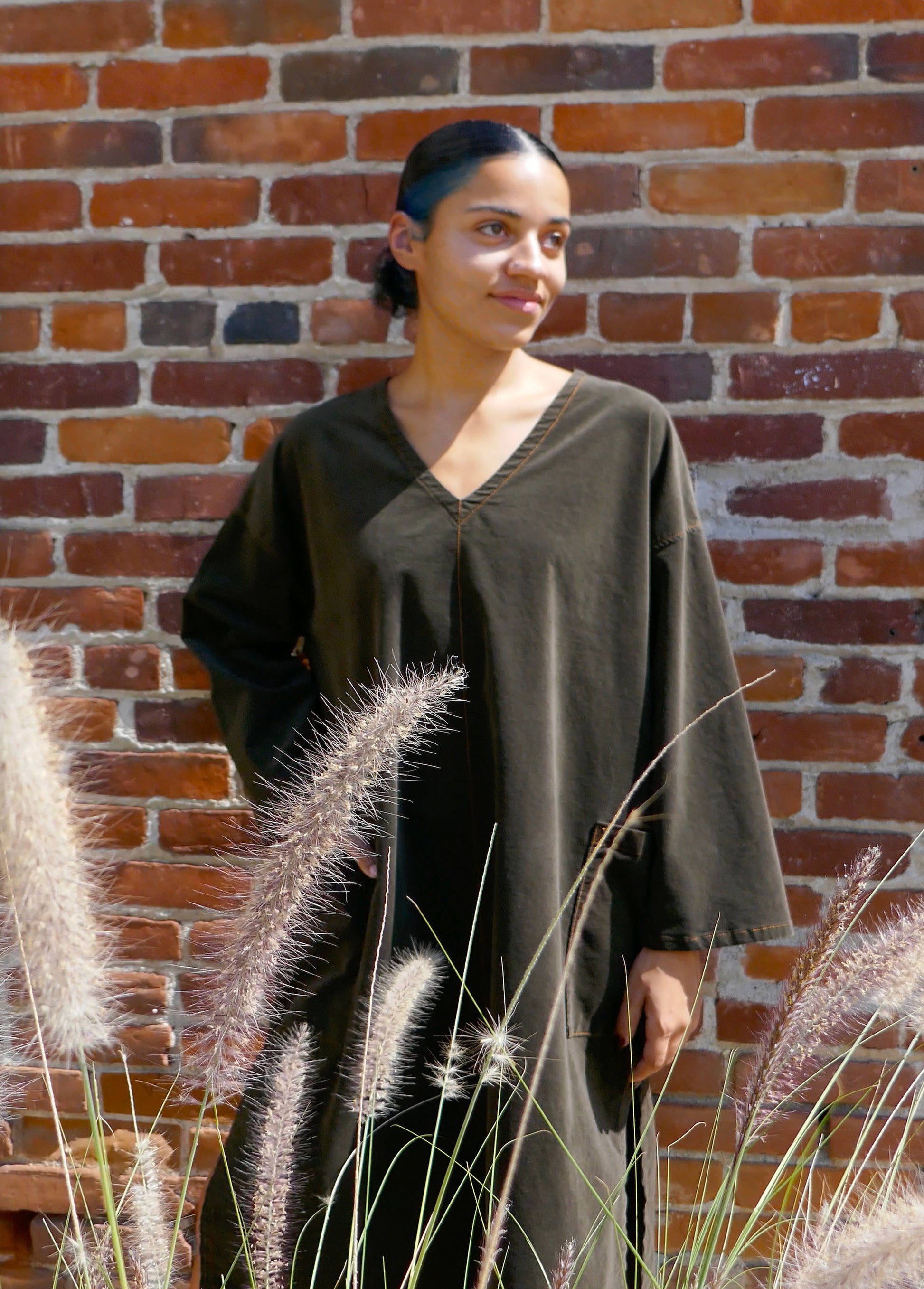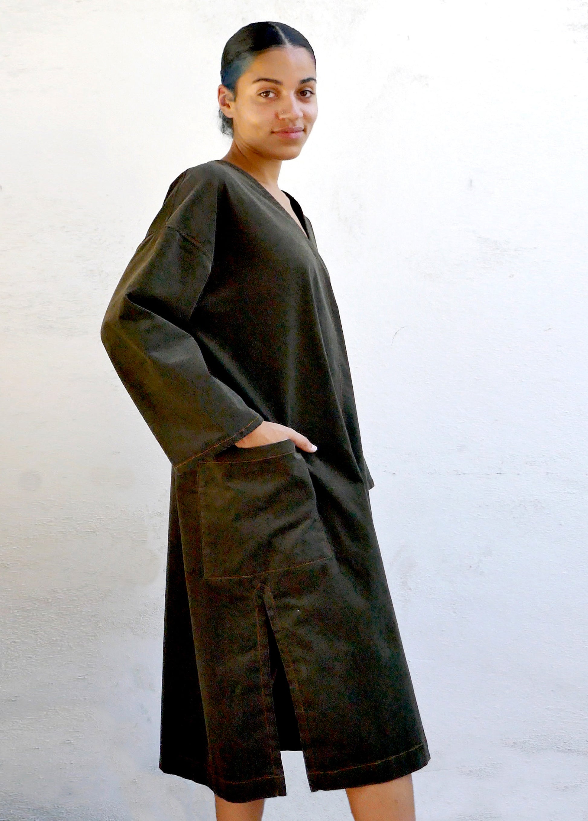 This is the easiest dress you'll ever own. Made from soft and luxurious thin wale corduroy. Throw it on in the morning to enjoy your favorite warm beverage in the garden. V-neck and generous cut for maximum comfort. Signature marrow stitch at hems. Side pockets and slits at sides. Wear it with V neck in front or back.