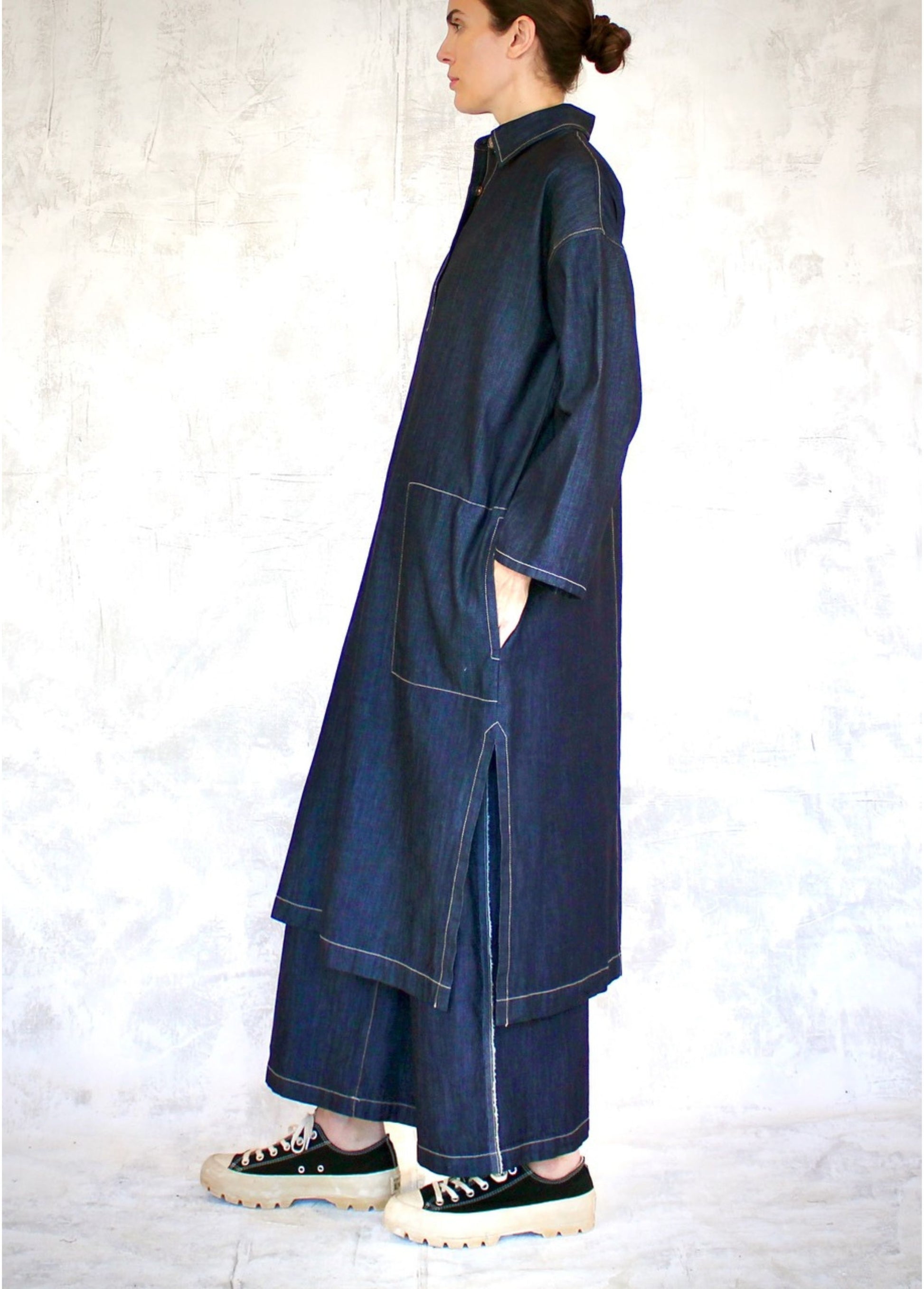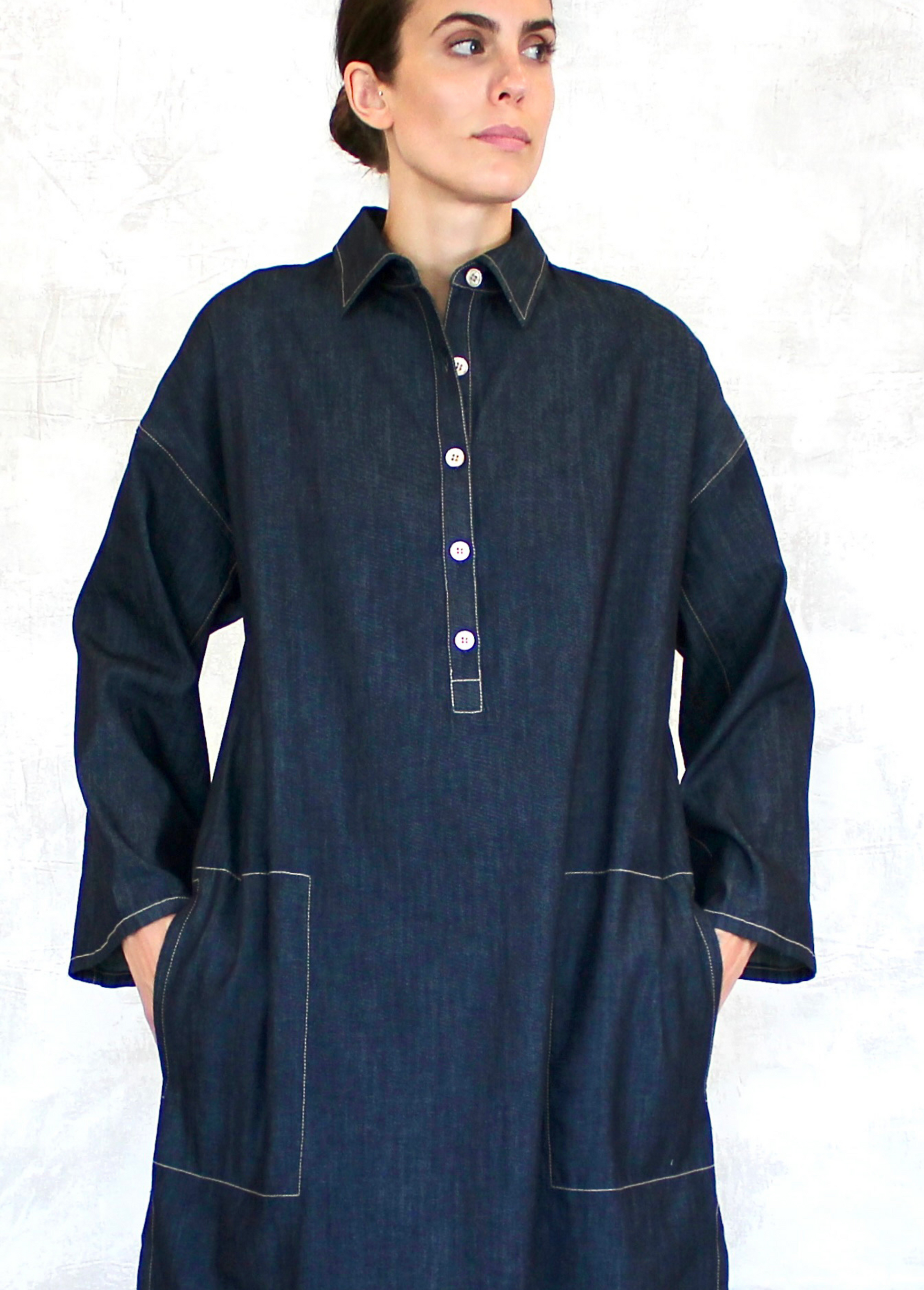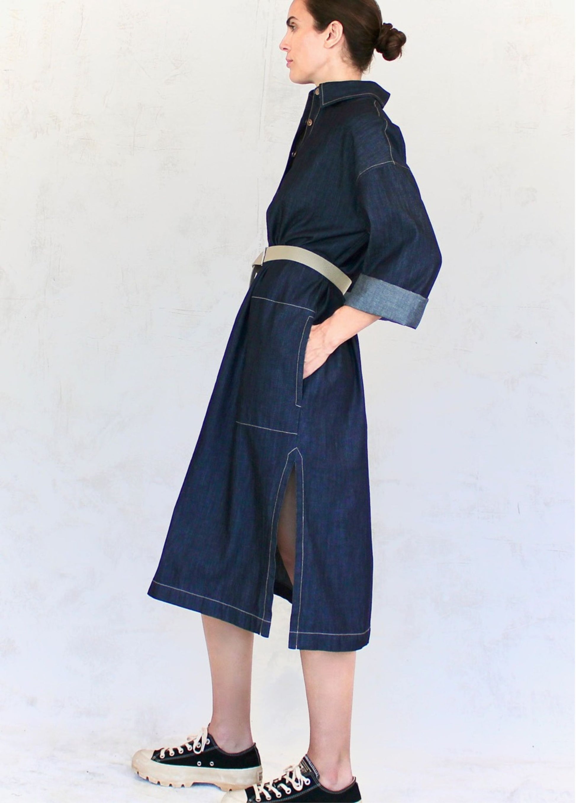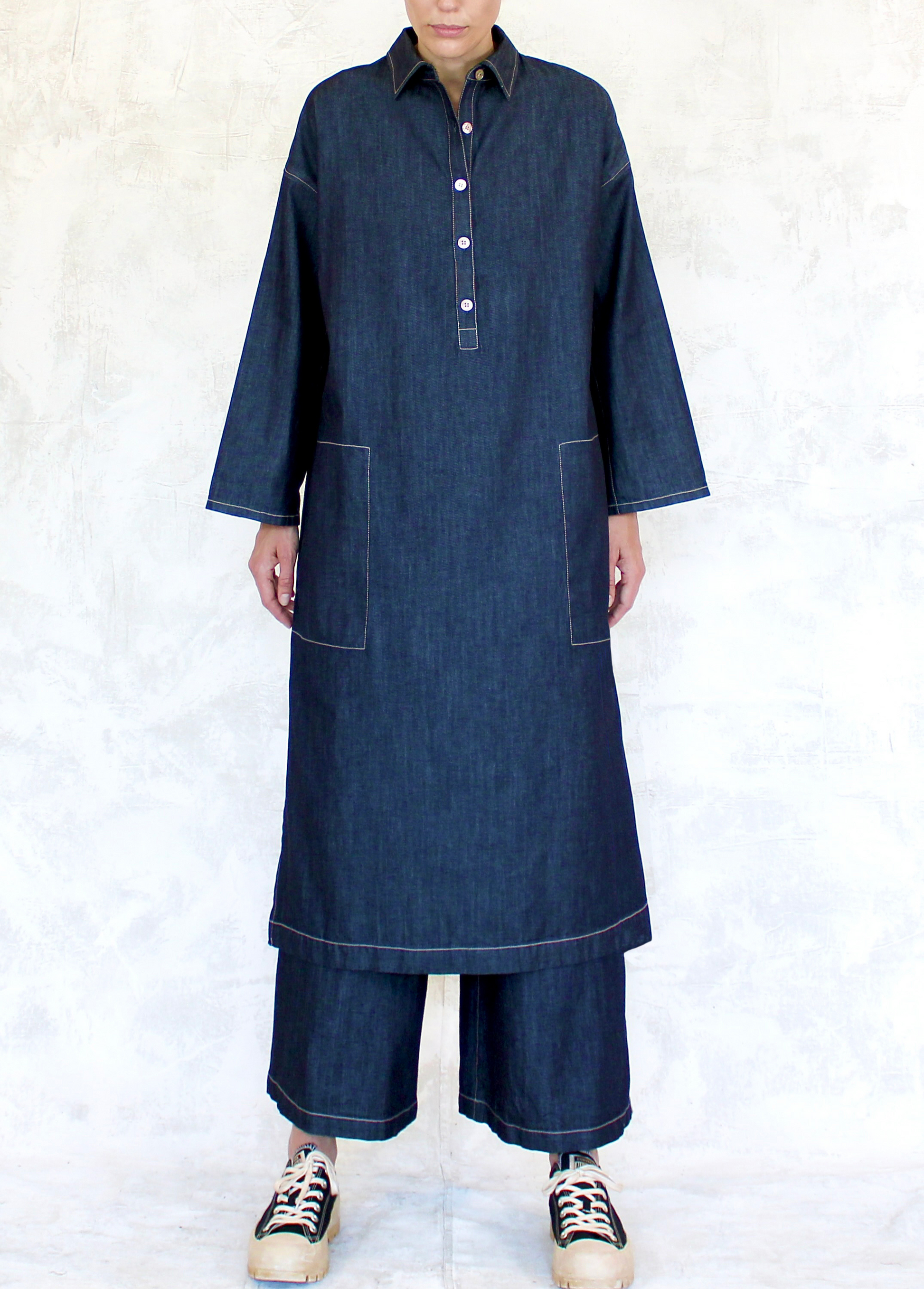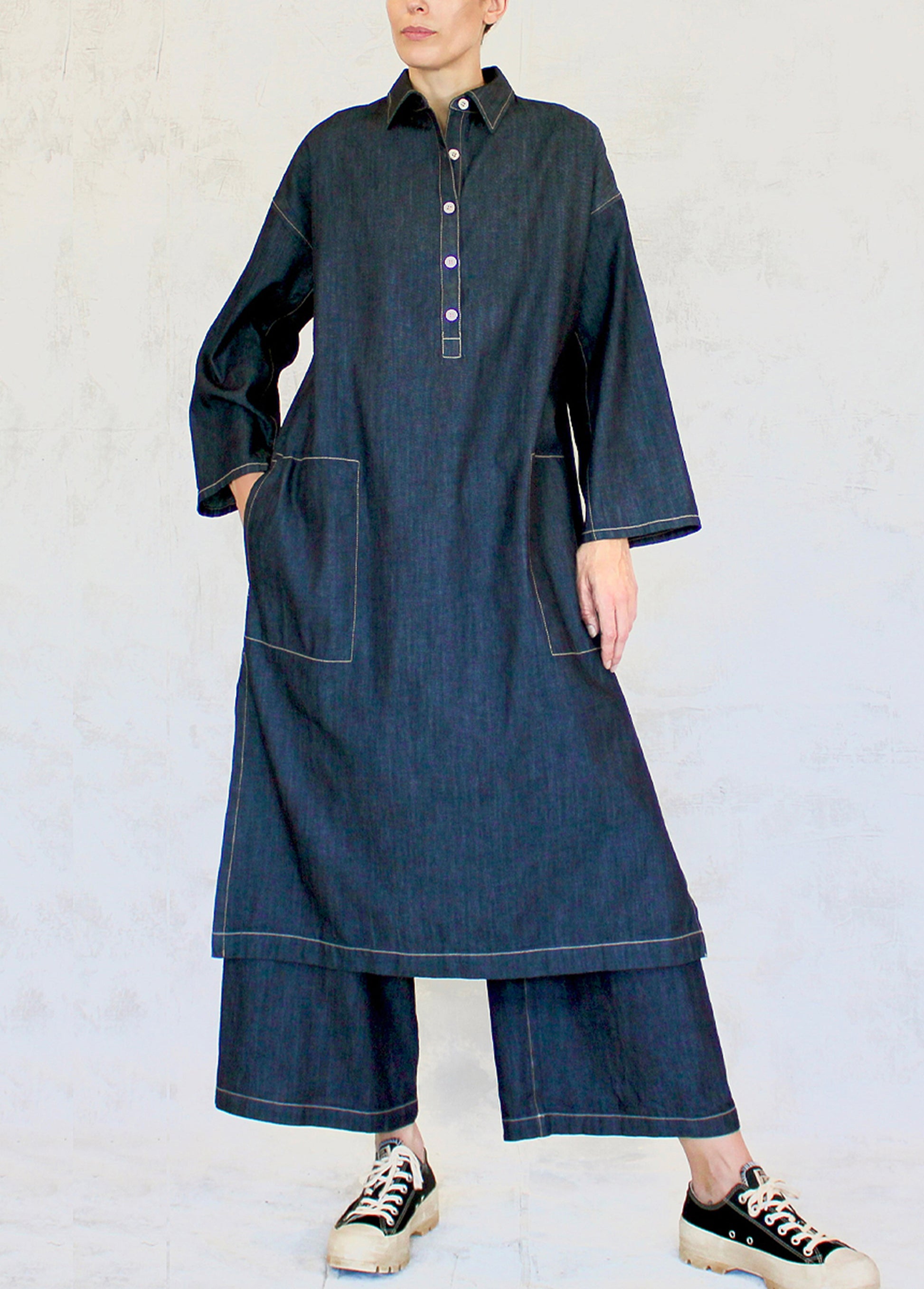 The season's most versatile shirt dress, made from a super soft, lightweight, 100% GOTS certified cotton denim. Throw it on in over our denim Picker's Pant, or belt it for a more tailored look. Front placket has 5 buttons with a classic shirt collar. Generous cut for maximum comfort. Signature top stitch. Side pockets and side slits. Organic farming supports, regional fair labor, clean water and healthy soil.