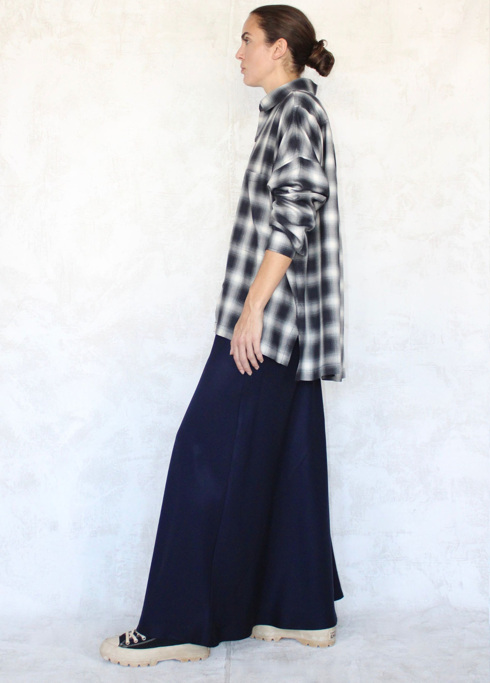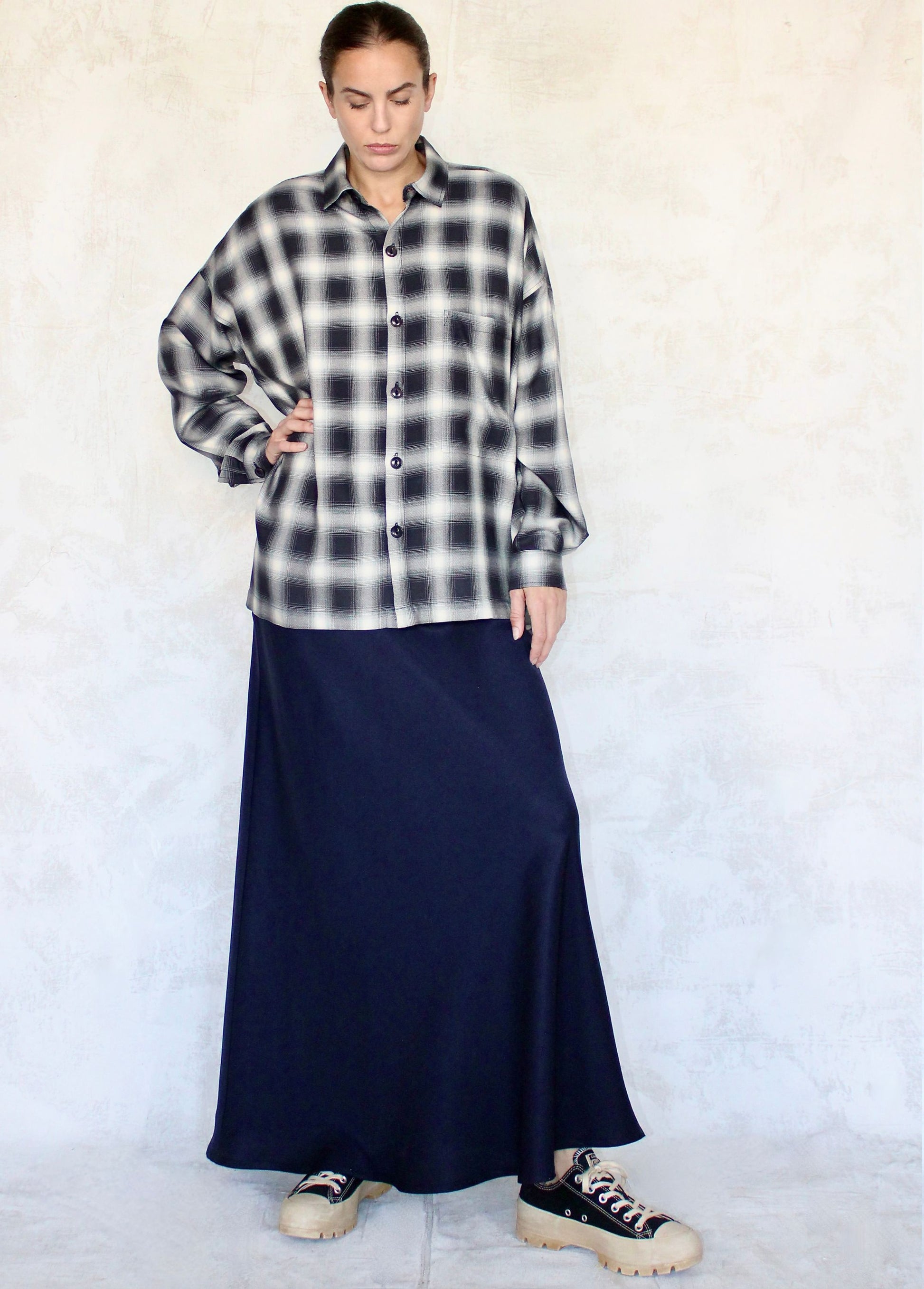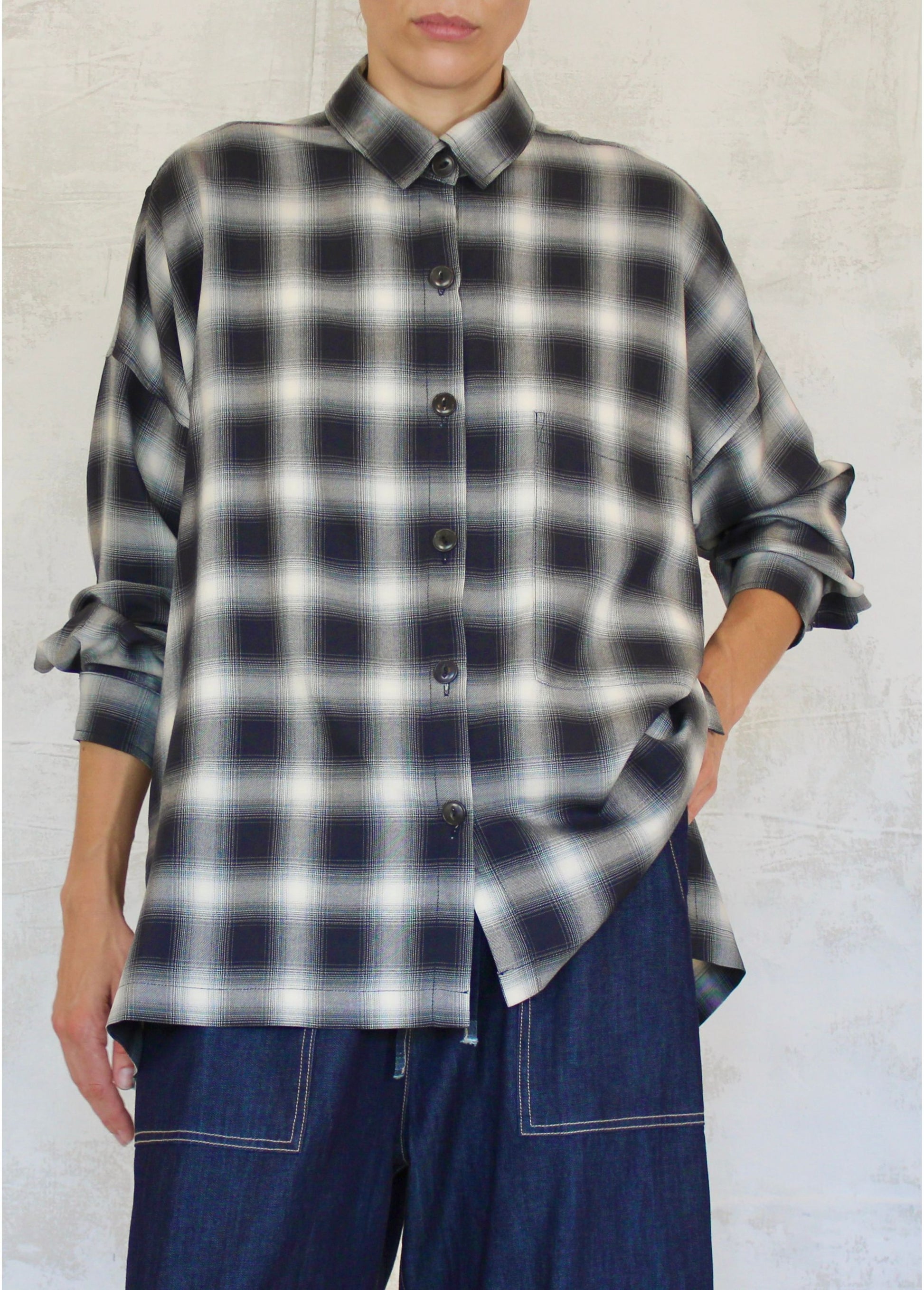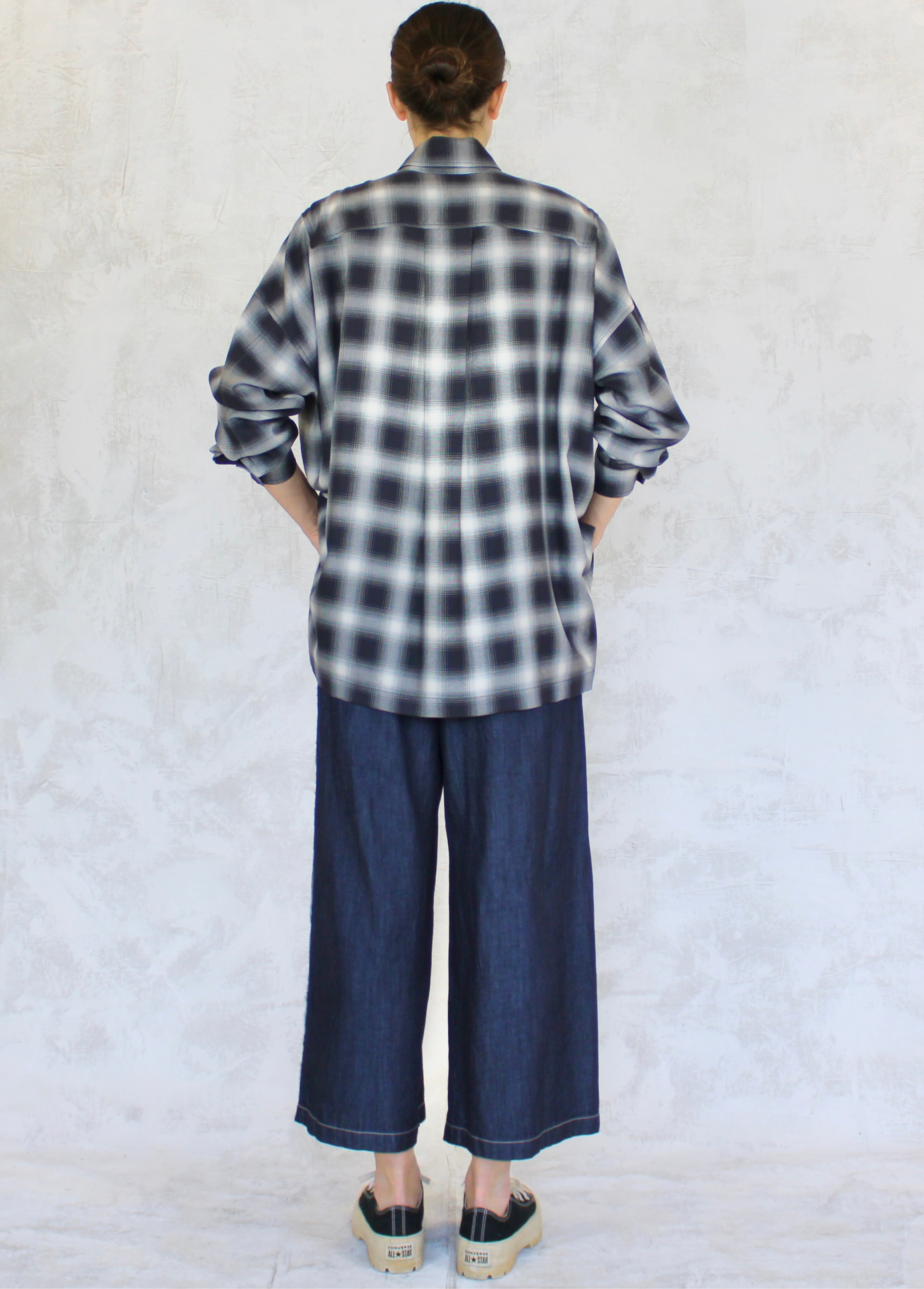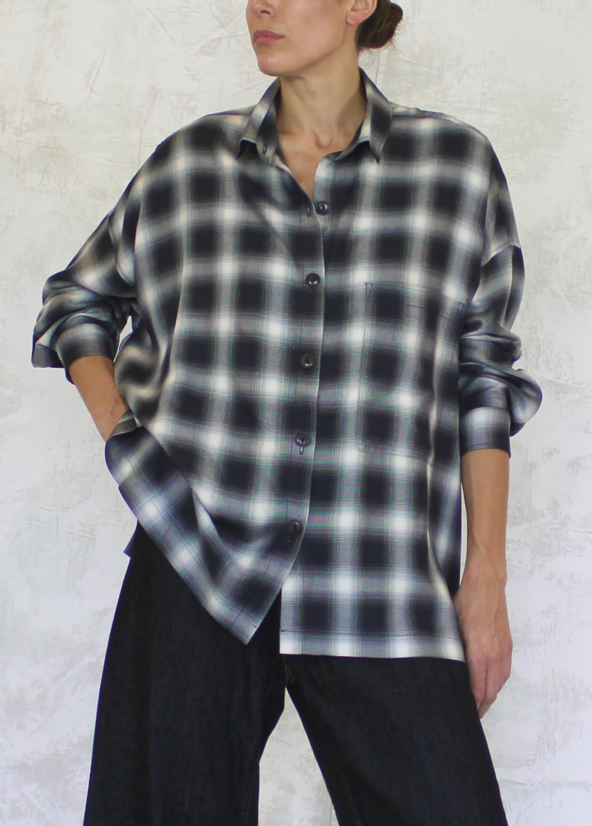 This elegantly oversized shirt made is made in a drapey yarn dye, plaid Tencel. Classic yet modern featuring an extreme dropped shoulder, cutaway collar, large front pocket and button front. Fitted cuffs, side slits, and subtle gathers at back yolk. We love it paired with our lightweight denim Picker's pant.