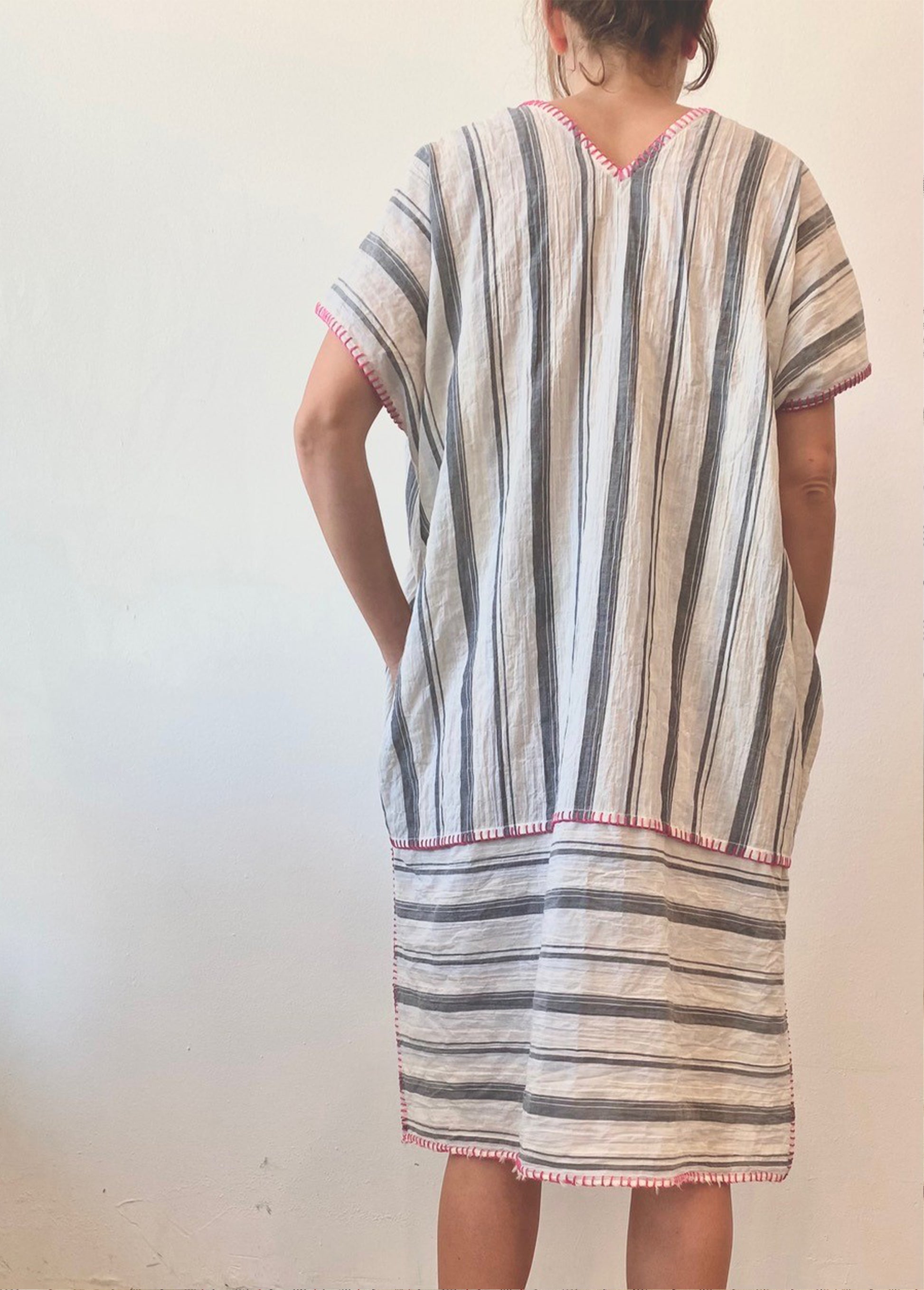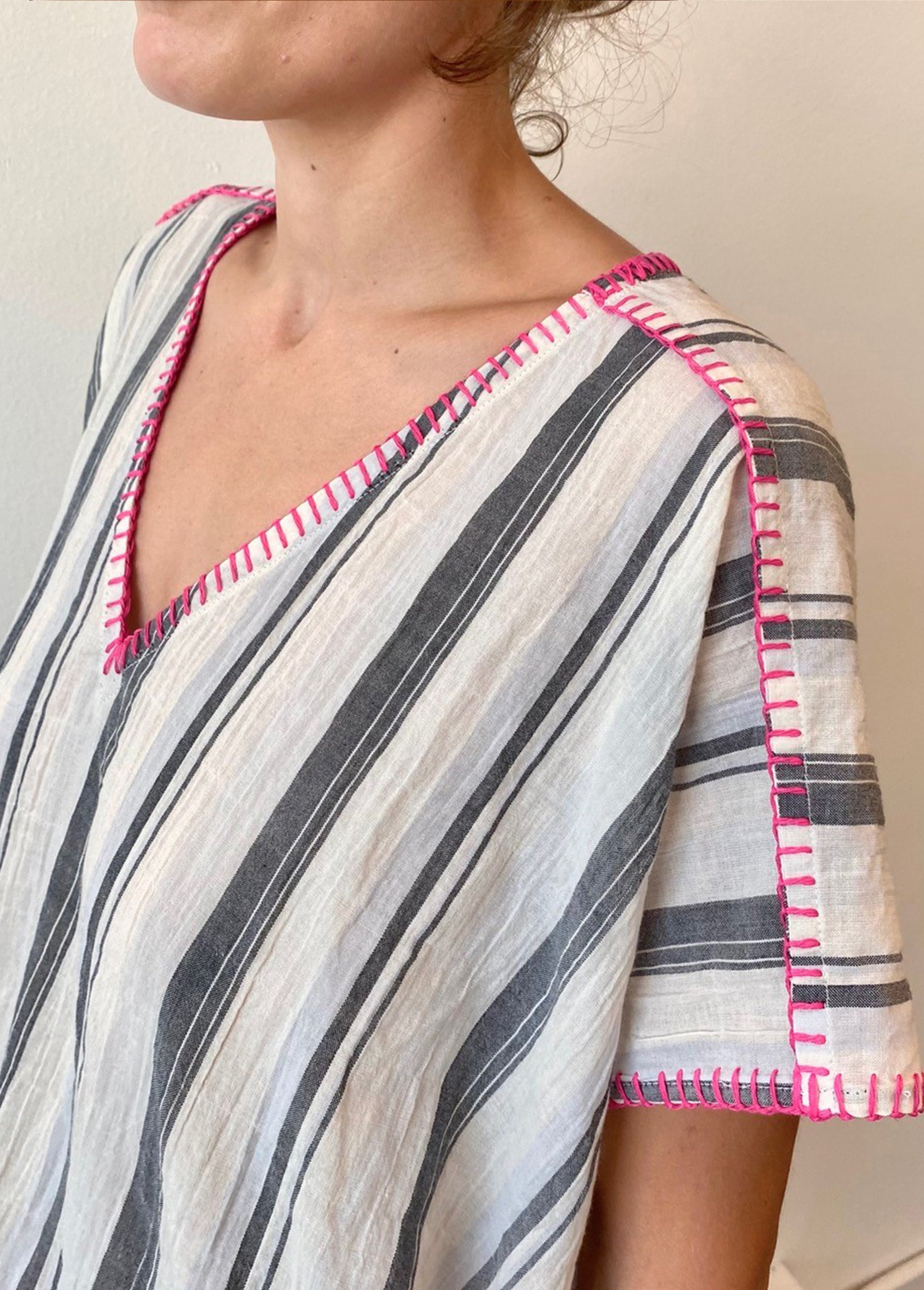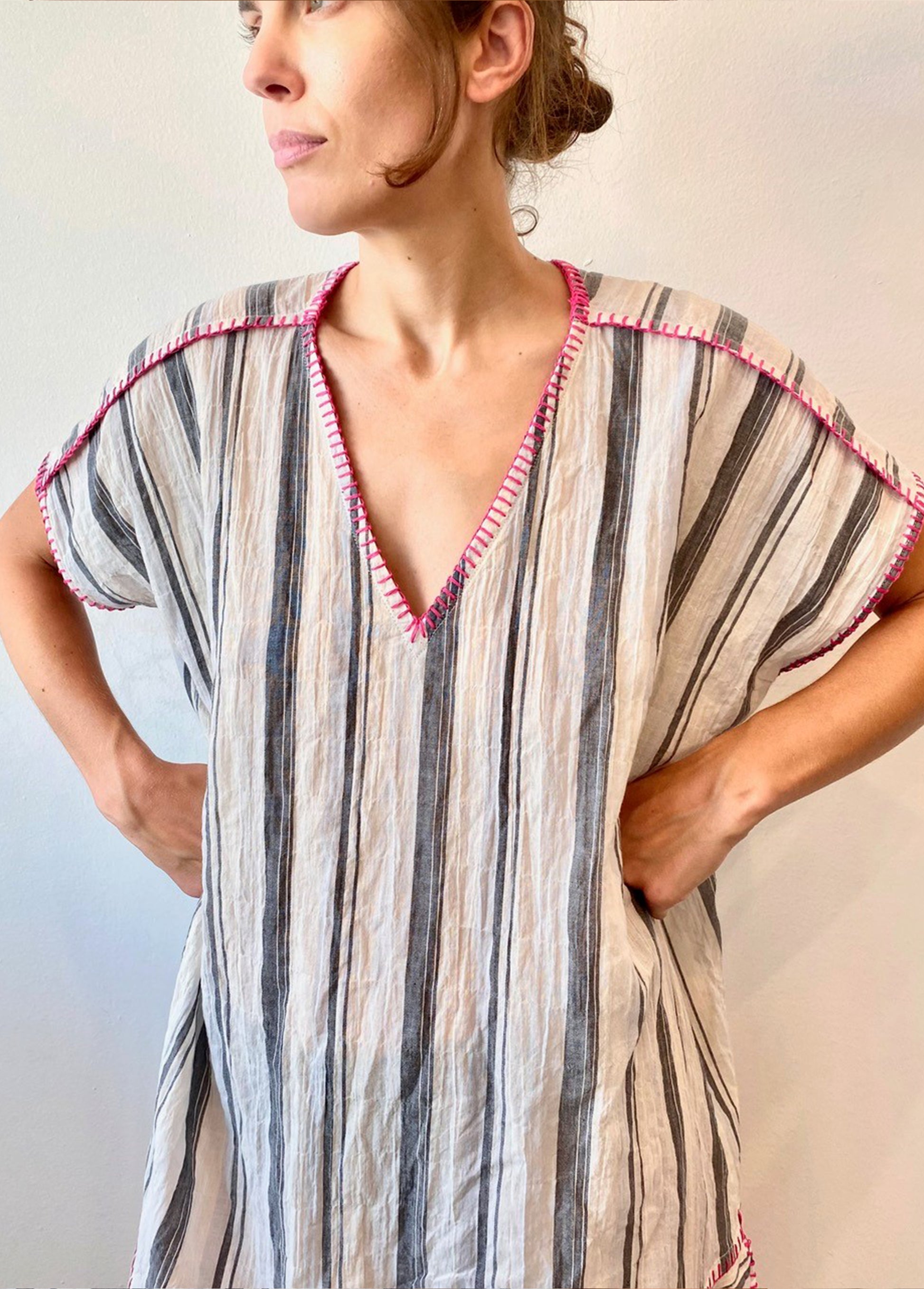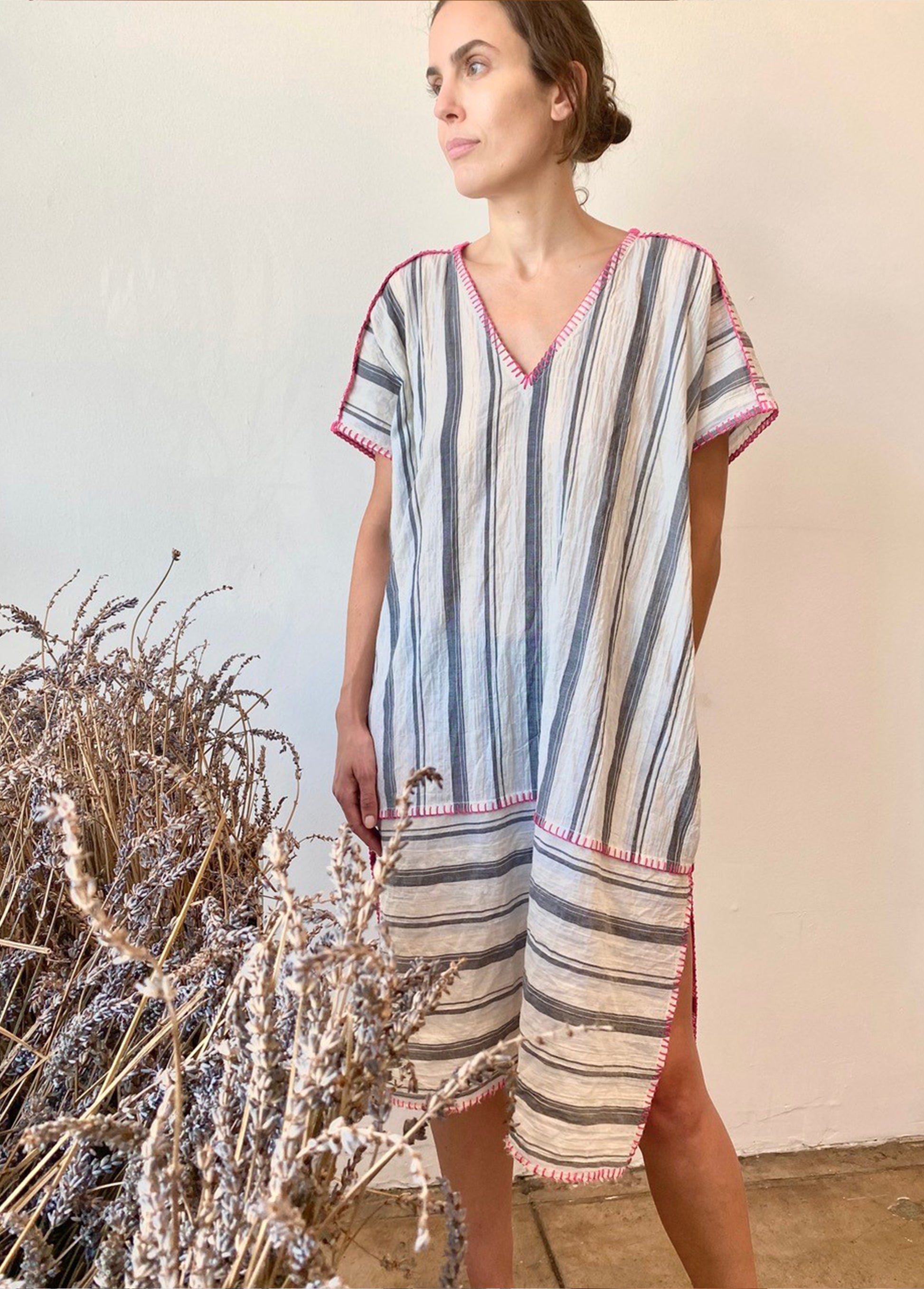 Effortless and versatile, wear this striped caftan all season long. Made from a striped yarn dyed organic cotton. Wear it as a beach cover up and an easy daytime dress. Throw on over our cotton poplin Pickers pant for evening. V-neck and generous cut for maximum comfort. Signature hand guided stitching with our antique crochet stitch machine and raw selvedge. Side pockets and side slits.