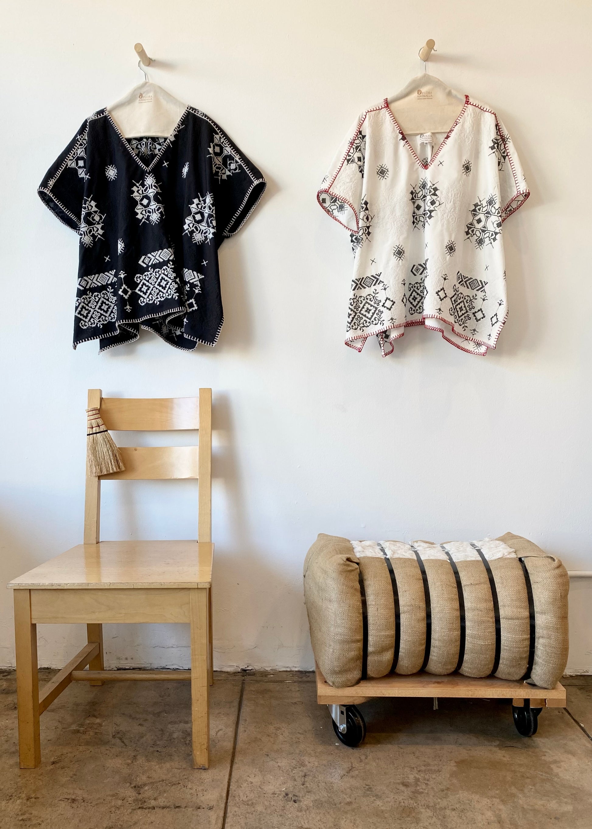 The embroidered styles with contrasting colors are finished with our signature edge stitch, sewn on an antique crochet-stitch machine—a quiet detail of hand-finished craft.